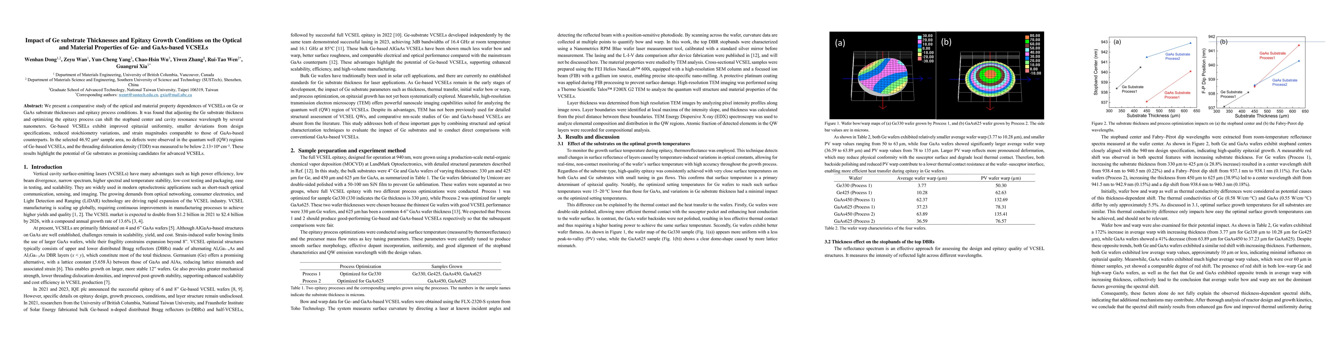 We present a comparative study of the optical and material property dependences of VCSELs on Ge or GaAs substrate thicknesses and epitaxy process conditions. It was found that adjusting the Ge substrate thickness and optimizing the epitaxy process can shift the stopband center and cavity resonance wavelength by several nanometers. Ge-based VCSELs exhibit improved epitaxial uniformity, smaller deviations from design specifications, reduced stoichiometry variations, and strain magnitudes comparable to those of GaAs-based counterparts. In the selected 46.92 square micron sample area, no defects were observed in the quantum well (QW) regions of Ge-based VCSELs, and the threading dislocation density (TDD) was measured to be below 2.13e6 per square cm. These results highlight the potential of Ge substrates as promising candidates for advanced VCSELs.