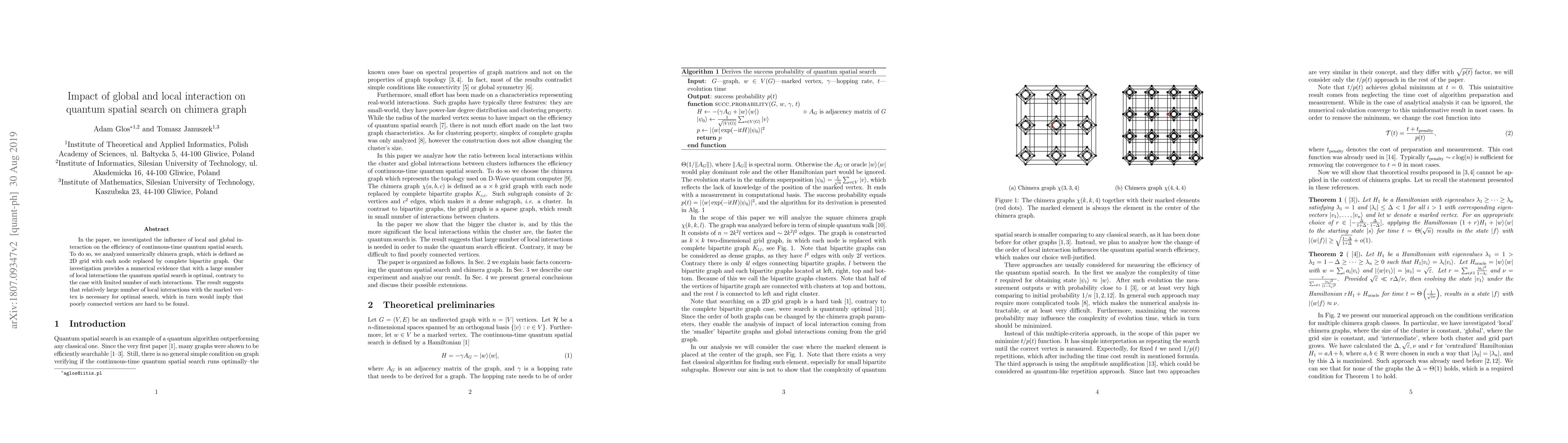 In the paper, we investigated the influence of local and global interaction on the efficiency of continuous-time quantum spatial search. To do so, we analyzed numerically chimera graph, which is defined as 2D grid with each node replaced by complete bipartite graph. Our investigation provides a numerical evidence that with a large number of local interactions the quantum spatial search is optimal, contrary to the case with limited number of such interactions. The result suggests that relatively large number of local interactions with the marked vertex is necessary for optimal search, which in turn would imply that poorly connected vertices are hard to be found.