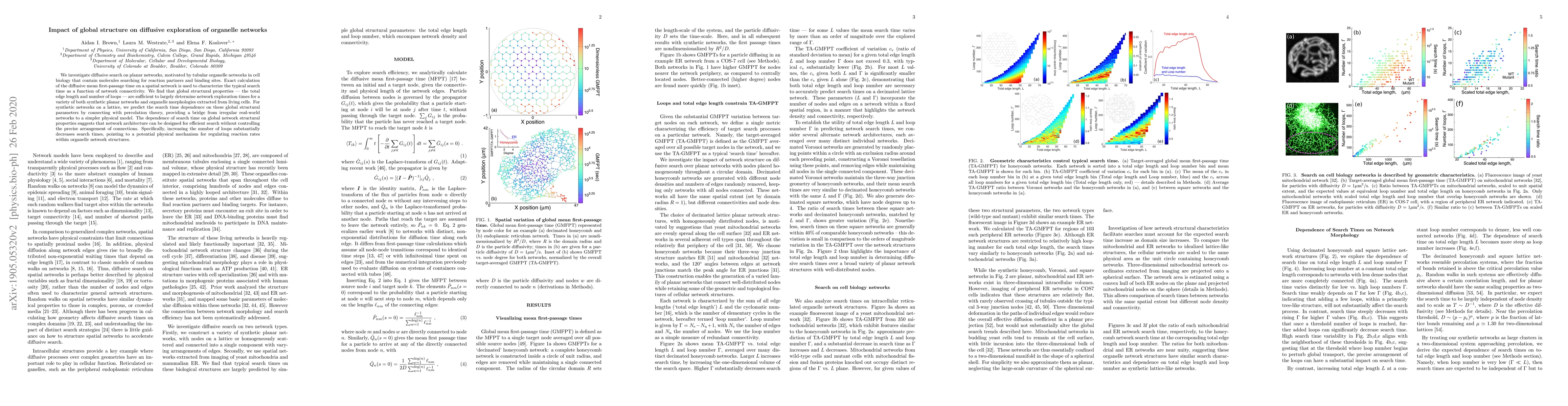 We investigate diffusive search on planar networks, motivated by tubular organelle networks in cell biology that contain molecules searching for reaction partners and binding sites. Exact calculation of the diffusive mean first-passage time on a spatial network is used to characterize the typical search time as a function of network connectivity. We find that global structural properties --- the total edge length and number of loops --- are sufficient to largely determine network exploration times for a variety of both synthetic planar networks and organelle morphologies extracted from living cells. For synthetic networks on a lattice, we predict the search time dependence on these global structural parameters by connecting with percolation theory, providing a bridge from irregular real-world networks to a simpler physical model. The dependence of search time on global network structural properties suggests that network architecture can be designed for efficient search without controlling the precise arrangement of connections. Specifically, increasing the number of loops substantially decreases search times, pointing to a potential physical mechanism for regulating reaction rates within organelle network structures.