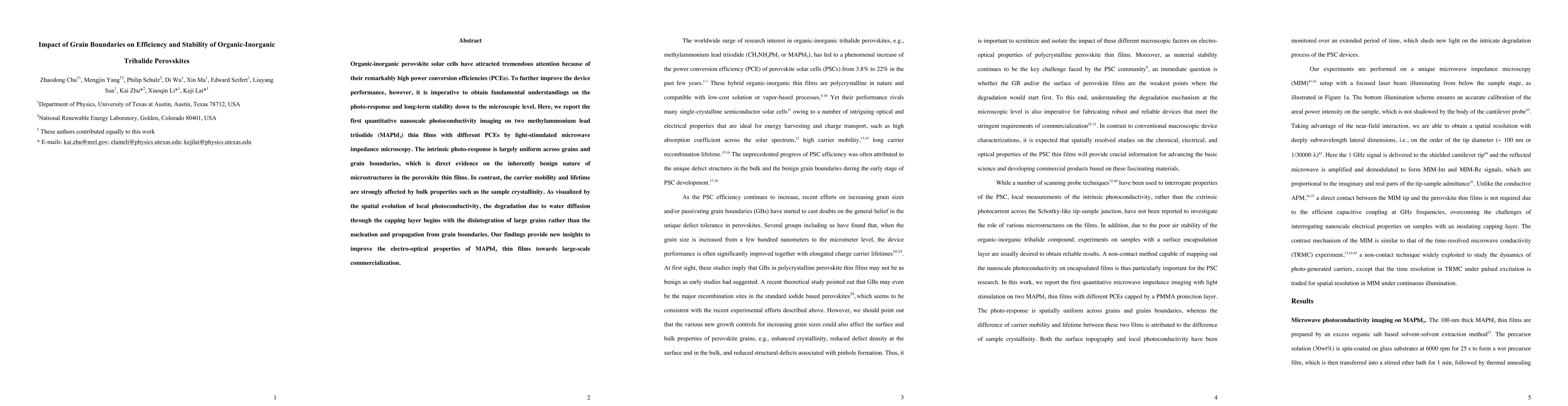 Organic-inorganic perovskite solar cells have attracted tremendous attention because of their remarkably high power conversion efficiencies (PCEs). To further improve the device performance, however, it is imperative to obtain fundamental understandings on the photo-response and long-term stability down to the microscopic level. Here, we report the first quantitative nanoscale photoconductivity imaging on two methylammonium lead triiodide (MAPbI3) thin films with different PCEs by light-stimulated microwave impedance microscopy. The intrinsic photo-response is largely uniform across grains and grain boundaries, which is direct evidence on the inherently benign nature of microstructures in the perovskite thin films. In contrast, the carrier mobility and lifetime are strongly affected by bulk properties such as the sample crystallinity. As visualized by the spatial evolution of local photoconductivity, the degradation due to water diffusion through the capping layer begins with the disintegration of large grains rather than the nucleation and propagation from grain boundaries. Our findings provide new insights to improve the electro-optical properties of MAPbI3 thin films towards large-scale commercialization.