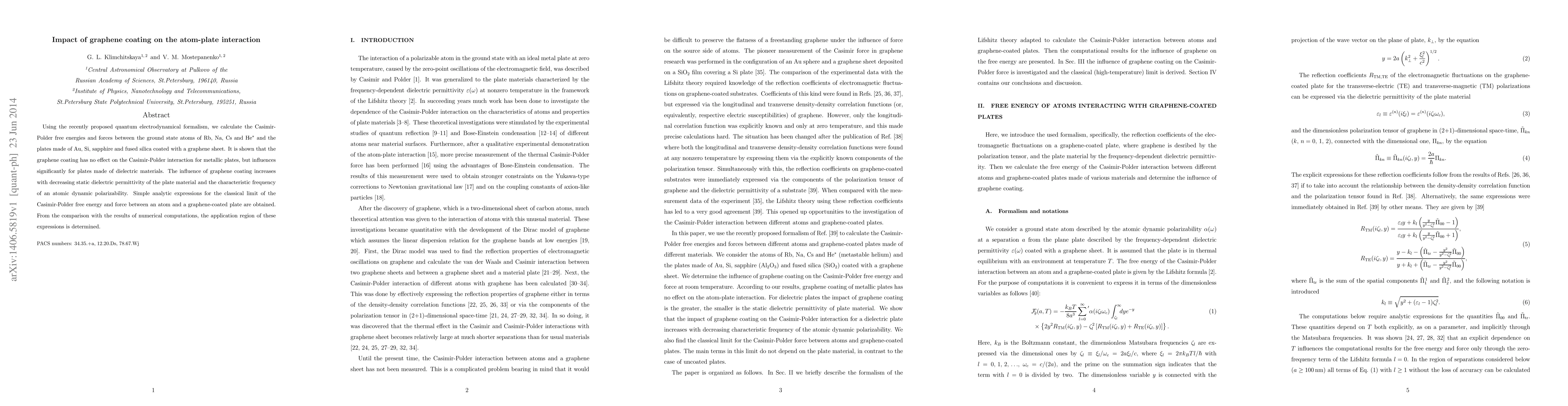 The study reveals that graphene coating does not affect the Casimir-Polder interaction for metallic plates but significantly influences it for dielectric plates, with stronger impact as the dielectric permittivity decreases. Simple analytic expressions for the classical limit of the interaction are derived and validated against numerical computations.