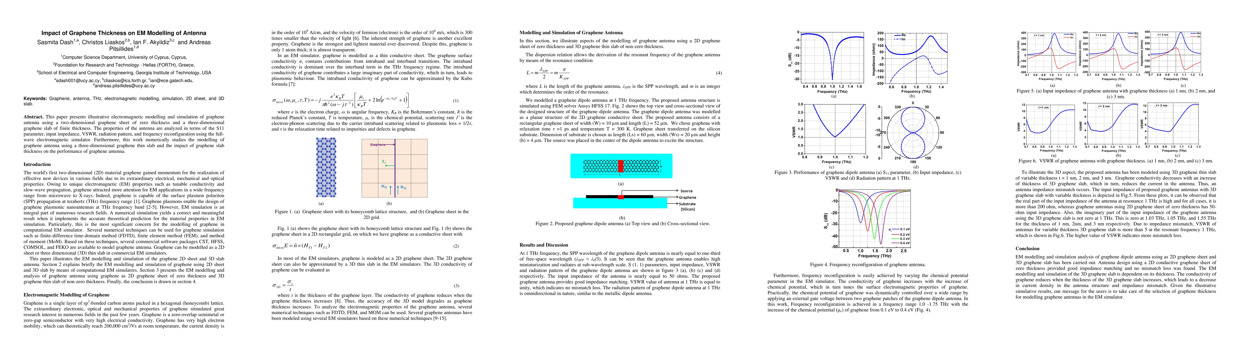 This paper uses electromagnetic simulations to analyze graphene antenna performance, comparing a zero-thickness 2D graphene sheet and finite-thickness 3D graphene slabs. Key findings include the impact of graphene thickness on S11 parameter, input impedance, VSWR, radiation pattern, and frequency reconfiguration.