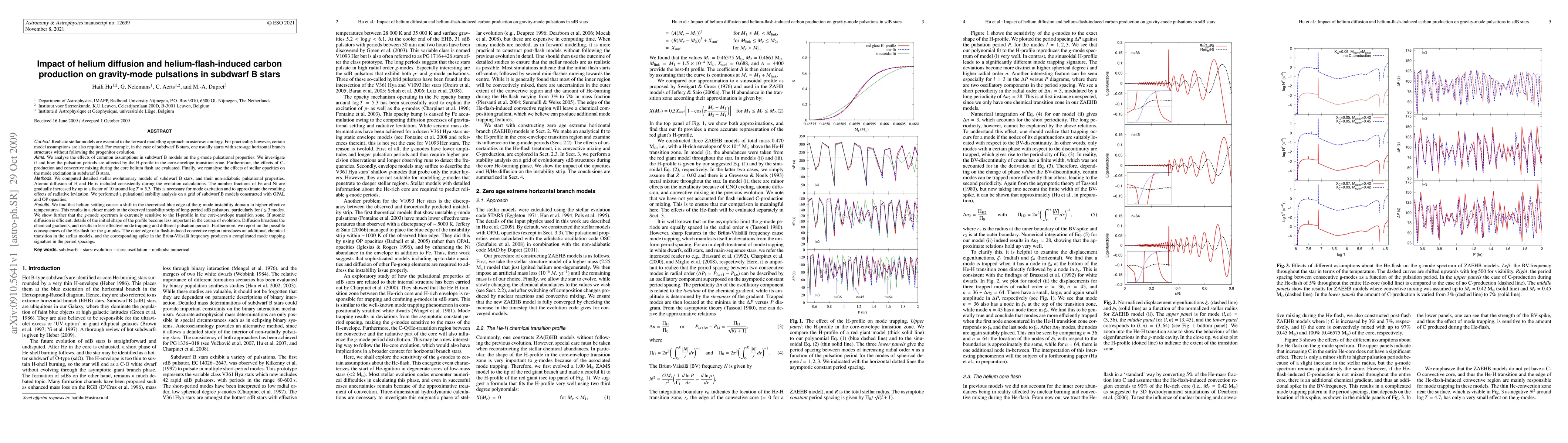 This study examines the impact of helium diffusion and helium-flash-induced carbon production on gravity-mode pulsations in subdwarf B stars, finding that helium settling shifts the theoretical instability domain to higher temperatures, aligning better with observed pulsators. The research also reveals that the g-mode spectrum is highly sensitive to the hydrogen profile in the core-envelope transition zone, with diffusion affecting mode trapping and pulsation periods.