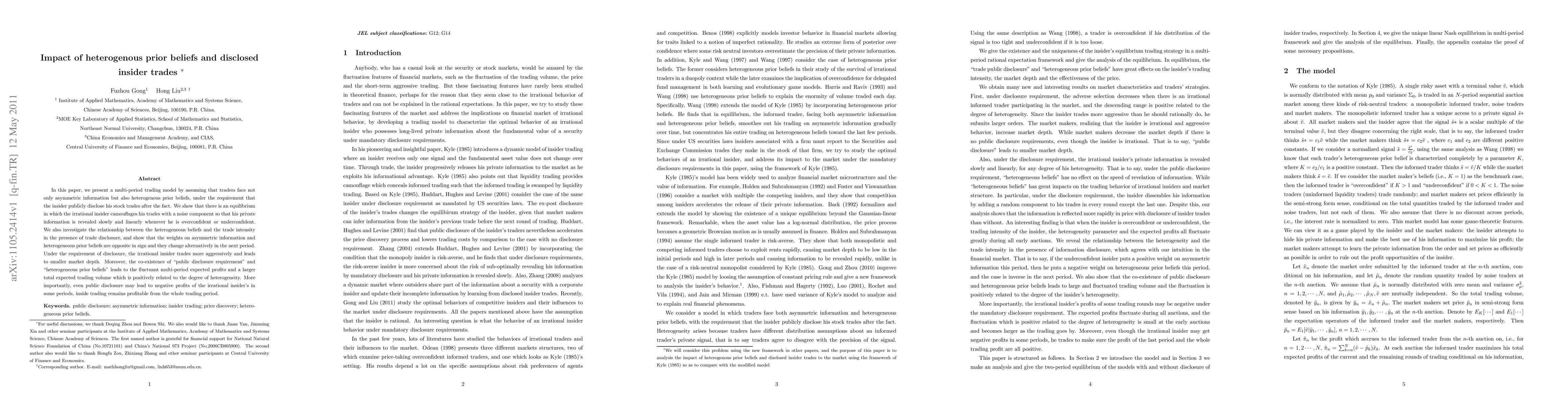 In this paper, we present a multi-period trading model by assuming that traders face not only asymmetric information but also heterogenous prior beliefs, under the requirement that the insider publicly disclose his stock trades after the fact. We show that there is an equilibrium in which the irrational insider camouflages his trades with a noise component so that his private information is revealed slowly and linearly whenever he is overconfident or underconfident. We also investigate the relationship between the heterogeneous beliefs and the trade intensity in the presence of trade disclosure, and show that the weights on asymmetric information and heterogeneous prior beliefs are opposite in sign and they change alternatively in the next period. Under the requirement of disclosure, the irrational insider trades more aggressively and leads to smaller market depth. Moreover, the co-existence of "public disclosure requirement" and "heterogeneous prior beliefs" leads to the fluctuant multi-period expected profits and a larger total expected trading volume which is positively related to the degree of heterogeneity. More importantly, even public disclosure may lead to negative profits of the irrational insider's in some periods, inside trading remains profitable from the whole trading period.