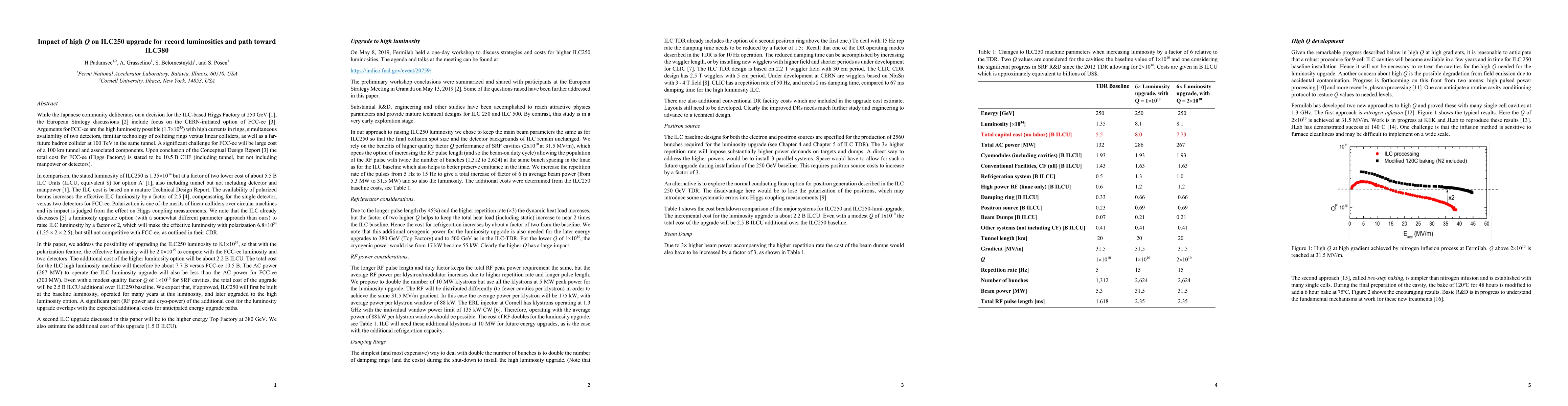 Research proposes upgrading ILC250 to achieve record luminosities of $8.1 imes 10^{34}$ at a cost significantly lower than FCC-ee ($7.7 B vs 10.5 B), with potential overlap in costs for future upgrades and energy paths.
