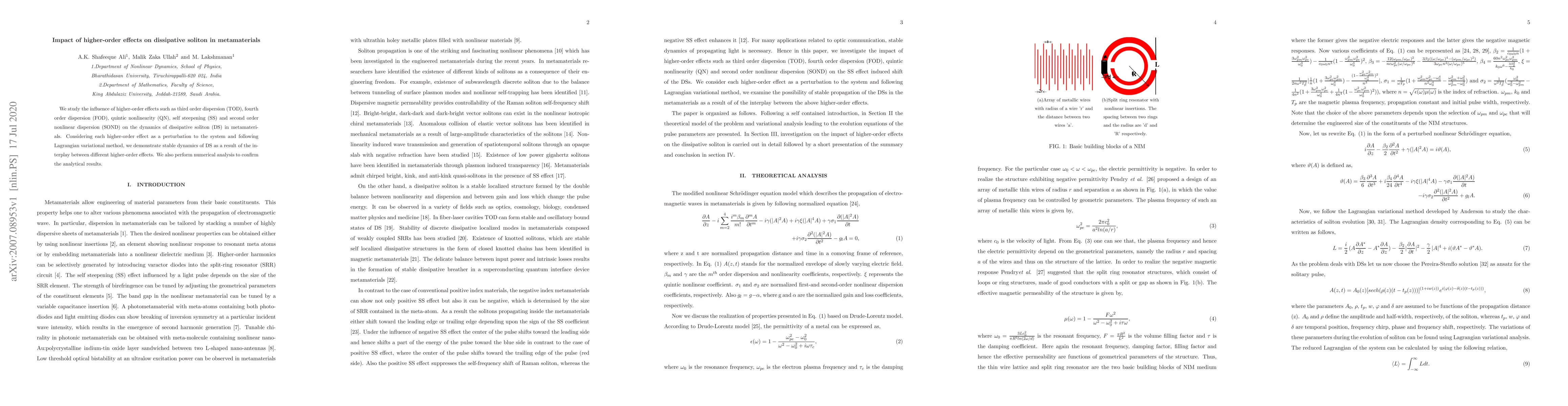 Researchers studied how higher-order effects influence dissipative solitons in metamaterials, finding stable dynamics through the interplay of these effects and confirming results with numerical analysis.