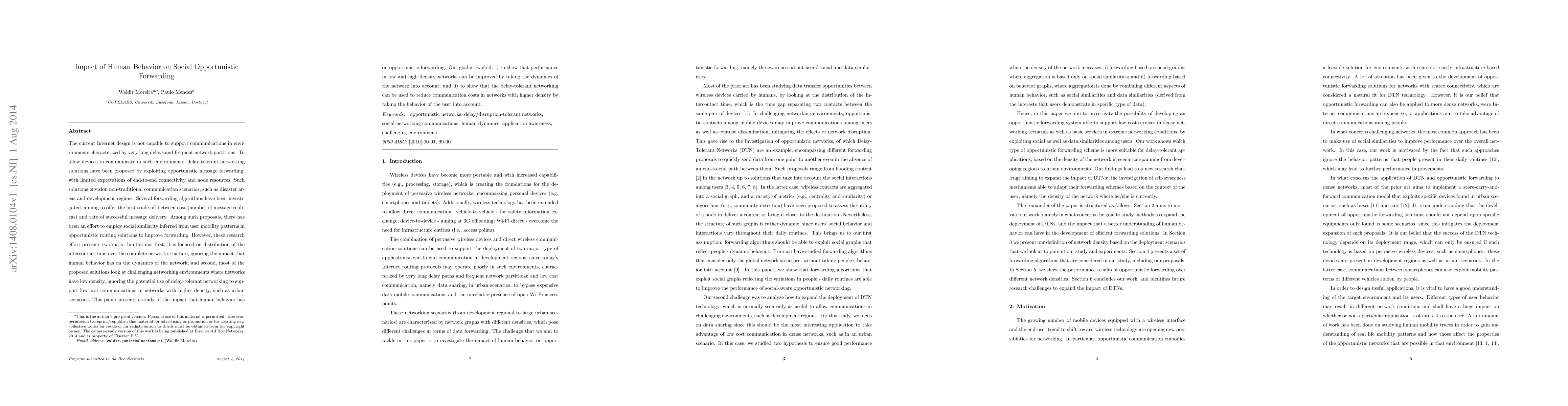 This paper investigates the influence of human behavior on social opportunistic forwarding in delay-tolerant networks, aiming to improve performance in both low and high density networks by considering network dynamics and user behavior. It demonstrates that incorporating human behavior can reduce communication costs even in denser urban environments.