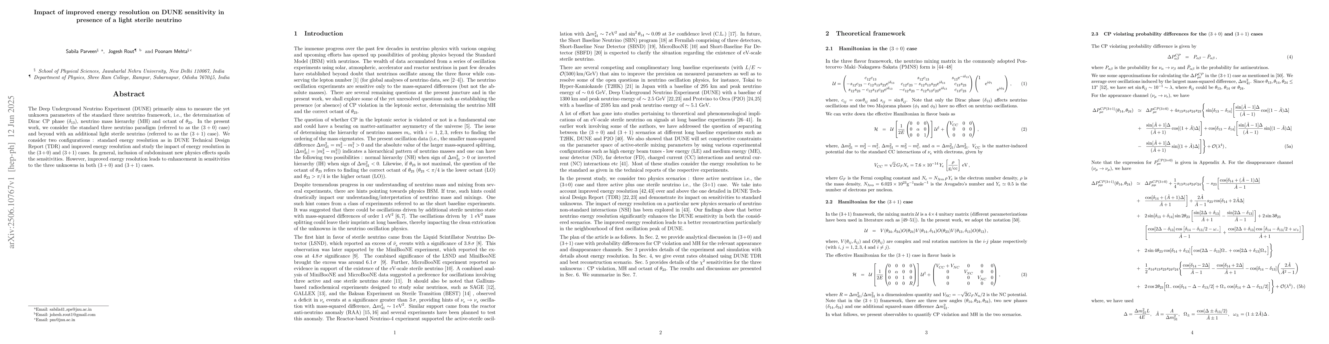 Improved energy resolution enhances DUNE's sensitivity to unknown neutrino parameters, overcoming effects of new physics in both standard 3-neutrino and extended (3+1) frameworks.