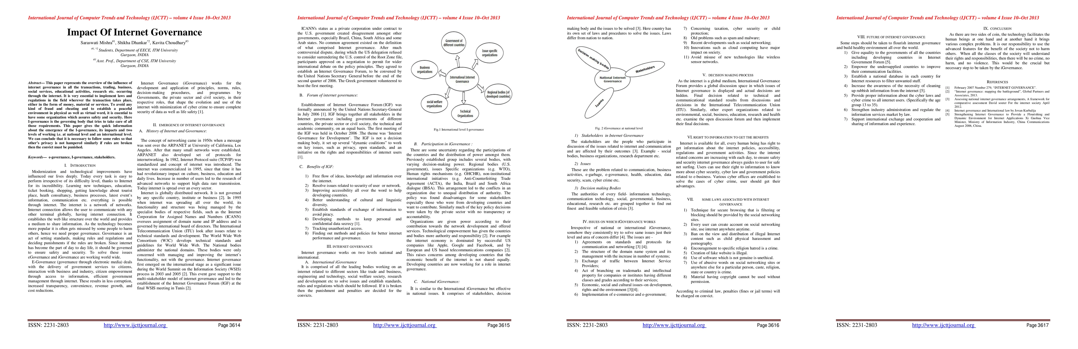This paper represents the overview of the influence of internet governance in all the transactions, trading, business, social services, educational activities, research etc. occurring through the internet. It is very essential to implement laws and regulations in the field wherever the transaction takes place, either in the form of money, material or services. To avoid any kind of fraud and cheating and to establish a peaceful environment in physical as well as virtual word, it is essential to have some organization which assures safety and security. Here I-governance is the governing body that tries to take care of all those requirements.