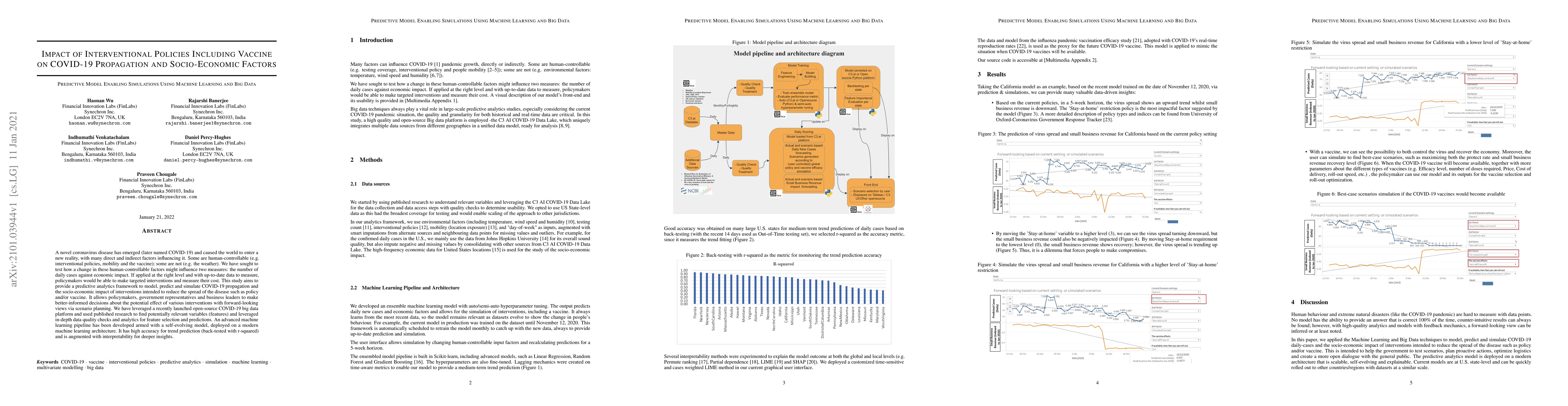 A novel coronavirus disease has emerged (later named COVID-19) and caused the world to enter a new reality, with many direct and indirect factors influencing it. Some are human-controllable (e.g. interventional policies, mobility and the vaccine); some are not (e.g. the weather). We have sought to test how a change in these human-controllable factors might influence two measures: the number of daily cases against economic impact. If applied at the right level and with up-to-date data to measure, policymakers would be able to make targeted interventions and measure their cost. This study aims to provide a predictive analytics framework to model, predict and simulate COVID-19 propagation and the socio-economic impact of interventions intended to reduce the spread of the disease such as policy and/or vaccine. It allows policymakers, government representatives and business leaders to make better-informed decisions about the potential effect of various interventions with forward-looking views via scenario planning. We have leveraged a recently launched open-source COVID-19 big data platform and used published research to find potentially relevant variables (features) and leveraged in-depth data quality checks and analytics for feature selection and predictions. An advanced machine learning pipeline has been developed armed with a self-evolving model, deployed on a modern machine learning architecture. It has high accuracy for trend prediction (back-tested with r-squared) and is augmented with interpretability for deeper insights.