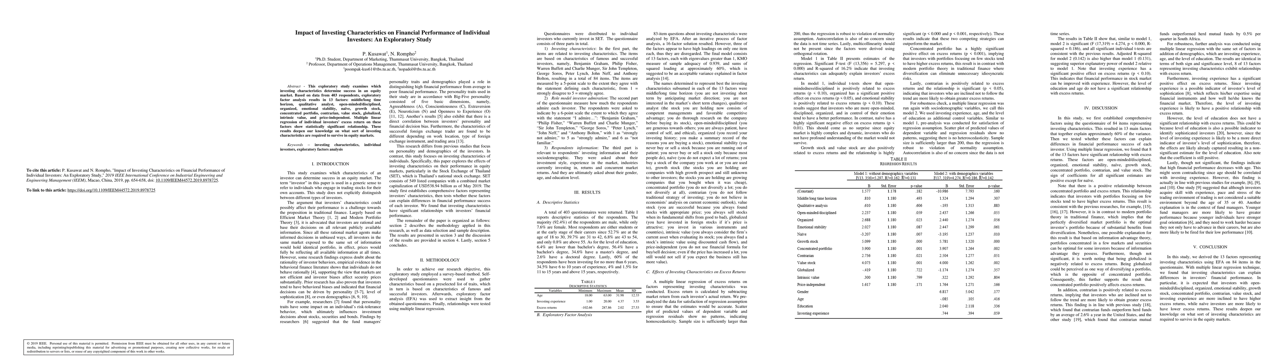 This exploratory study examines which investing characteristics determine success in an equity market. Based on data from 403 respondents, exploratory factor analysis results in 13 factors: middle/long time horizon, qualitative analyst, open-minded/disciplined, organized, emotional stability, na\"ive, growth stock, concentrated portfolio, contrarian, value stock, globalized, intrinsic value, and price-independent. Multiple linear regression of individual investors' excess return on these factors show statistically significant relationship. These results deepen our knowledge on what sort of investing characteristics are required to survive in equity markets.