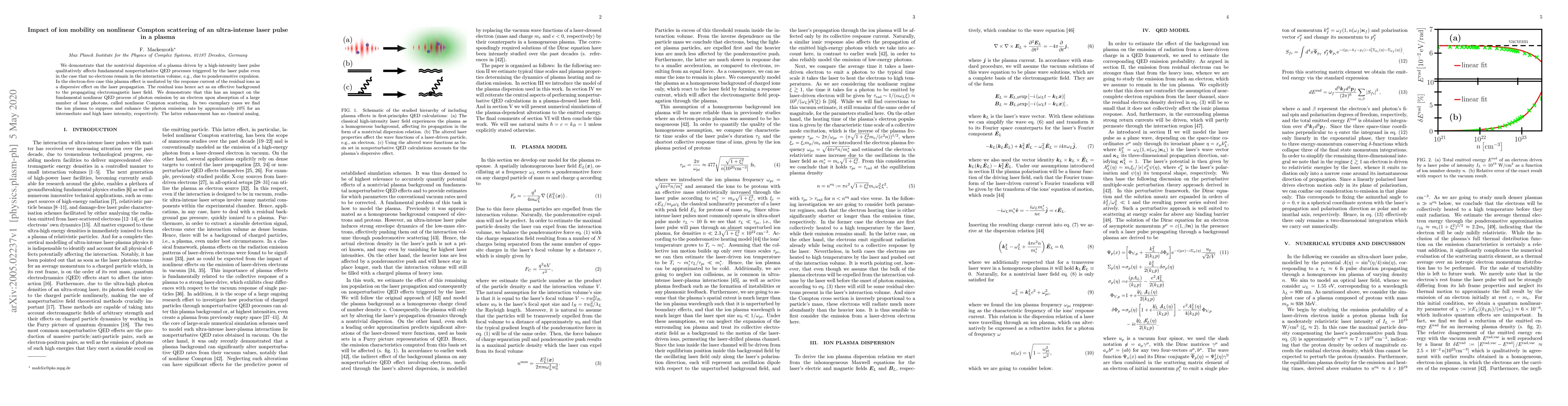 We demonstrate that the nontrivial dispersion of a plasma driven by a high-intensity laser pulse qualitatively affects fundamental nonperturbative QED processes triggered by the laser pulse even in the case that no electrons remain in the interaction volume, e.g., due to ponderomotive expulsion. In the electron-free case this plasma effect is mediated by the response current of the residual ions as a dispersive effect on the laser propagation. The residual ions hence act as an effective background to the propagating electromagnetic laser field. We demonstrate that this has an impact on the fundamental nonlinear QED process of photon emission by an electron upon absorption of a large number of laser photons, called nonlinear Compton scattering. In two exemplary cases we find the ion plasma to suppress and enhance the photon emission rate by approximately $10\%$ for an intermediate and high laser intensity, respectively. The latter enhancement has no classical analog.