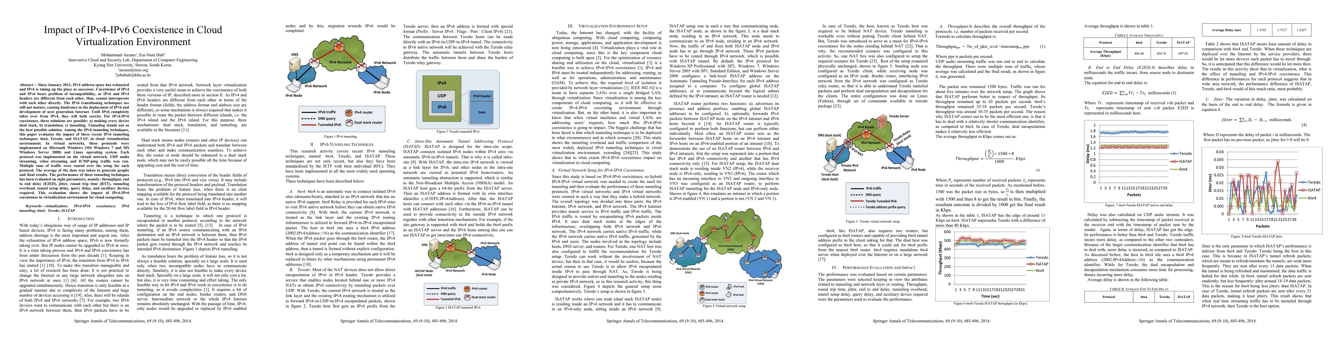 This paper evaluates the performance of three IPv6 tunneling techniques—6to4, Teredo, and ISATAP—in cloud virtualization environments. The study measures eight parameters including throughput, delay, and overhead to assess the impact of IPv4-IPv6 coexistence, highlighting tunneling as the most effective solution.