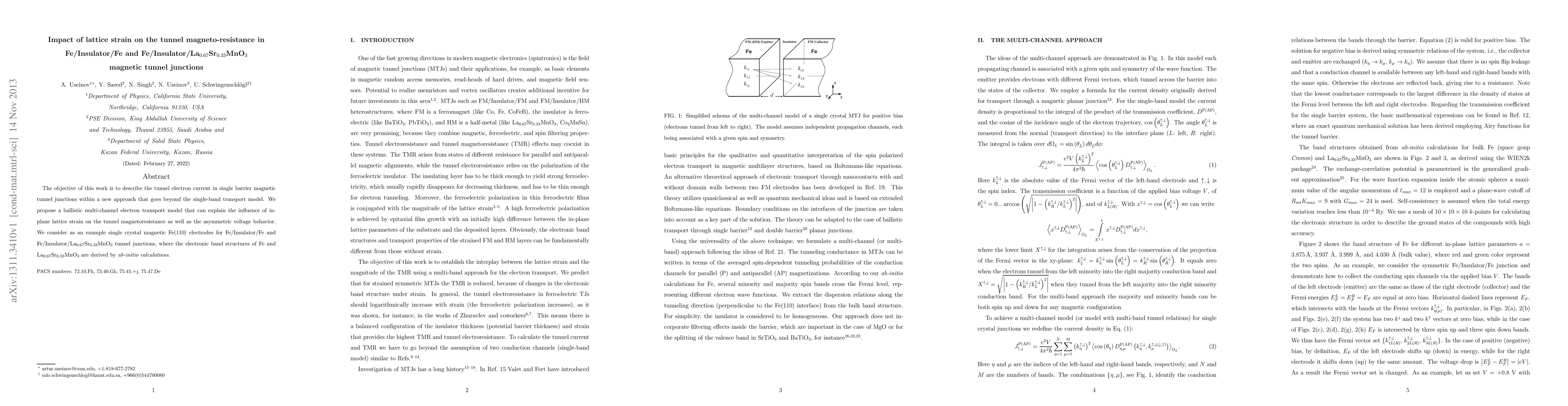 The objective of this work is to describe the tunnel electron current in single barrier magnetic tunnel junctions within a new approach that goes beyond the single-band transport model. We propose a ballistic multi-channel electron transport model that can explain the influence of in-plane lattice strain on the tunnel magnetoresistance as well as the asymmetric voltage behavior. We consider as an example single crystal magnetic Fe(110) electrodes for Fe/Insulator/Fe and Fe/Insulator/La$_{0.67}$Sr$_{0.33}$MnO$_{3}$ tunnel junctions, where the electronic band structures of Fe and La$_{0.67}$Sr$_{0.33}$MnO$_{3}$ are derived by \it{ab-initio} calculations.