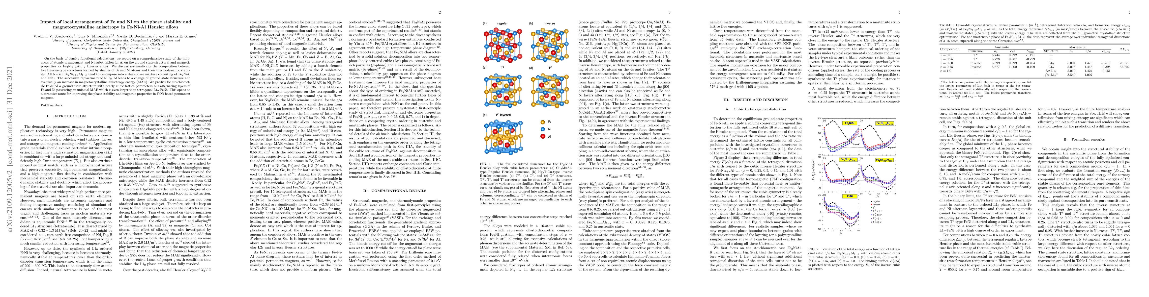 On the basis of density functional calculations, we report on a comprehensive study of the influences of atomic arrangement and Ni substitution for Al on the ground state structural and magnetic properties for Fe$_2$Ni$_{1+x}$Al$_{1-x}$ Heusler alloys. We discuss systematically the competition between five Heusler-type structures formed by shuffles of Fe and Ni atoms and their thermodynamic stability. All~Ni-rich Fe$_2$Ni$_{1+x}$Al$_{1-x}$ tend to decompose into a dual-phase mixture consisting of Fe$_2$NiAl and~FeNi. The~successive replacement of Ni by Al leads to a change of ground state structure and eventually an increase in magnetocrystalline anisotropy energy~(MAE). We predict for stoichiometric Fe$_2$NiAl a ground state structure with nearly cubic lattice parameters but alternating layers of Fe and Ni possessing an uniaxial MAE which is even larger than tetragonal L1$_0$-FeNi. This opens an alternative route for improving the phase stability and magnetic properties in FeNi-based permanent magnets.