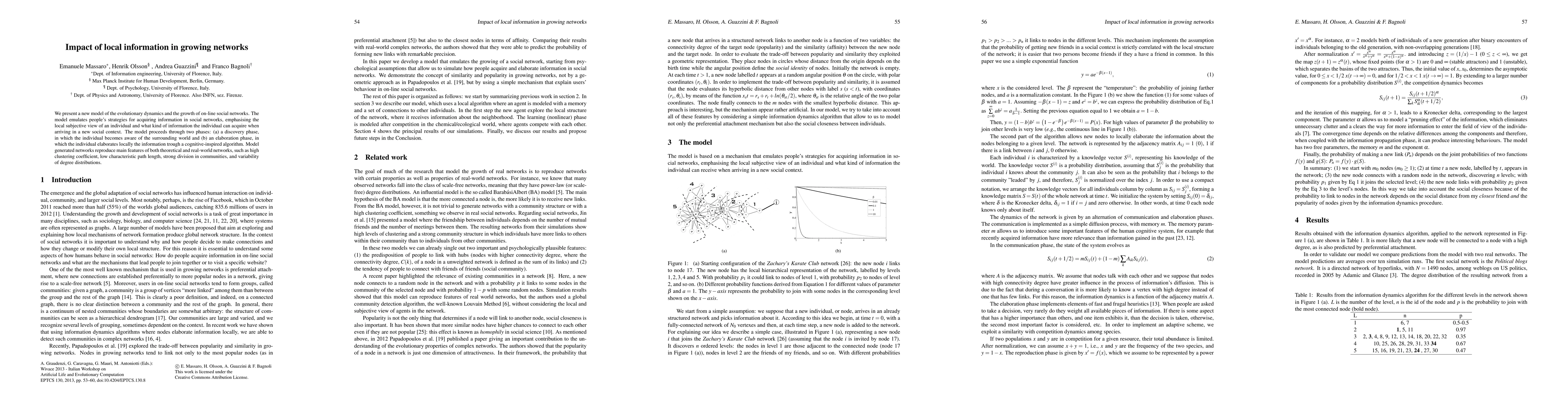 We present a new model of the evolutionary dynamics and the growth of on-line social networks. The model emulates people's strategies for acquiring information in social networks, emphasising the local subjective view of an individual and what kind of information the individual can acquire when arriving in a new social context. The model proceeds through two phases: (a) a discovery phase, in which the individual becomes aware of the surrounding world and (b) an elaboration phase, in which the individual elaborates locally the information trough a cognitive-inspired algorithm. Model generated networks reproduce main features of both theoretical and real-world networks, such as high clustering coefficient, low characteristic path length, strong division in communities, and variability of degree distributions.