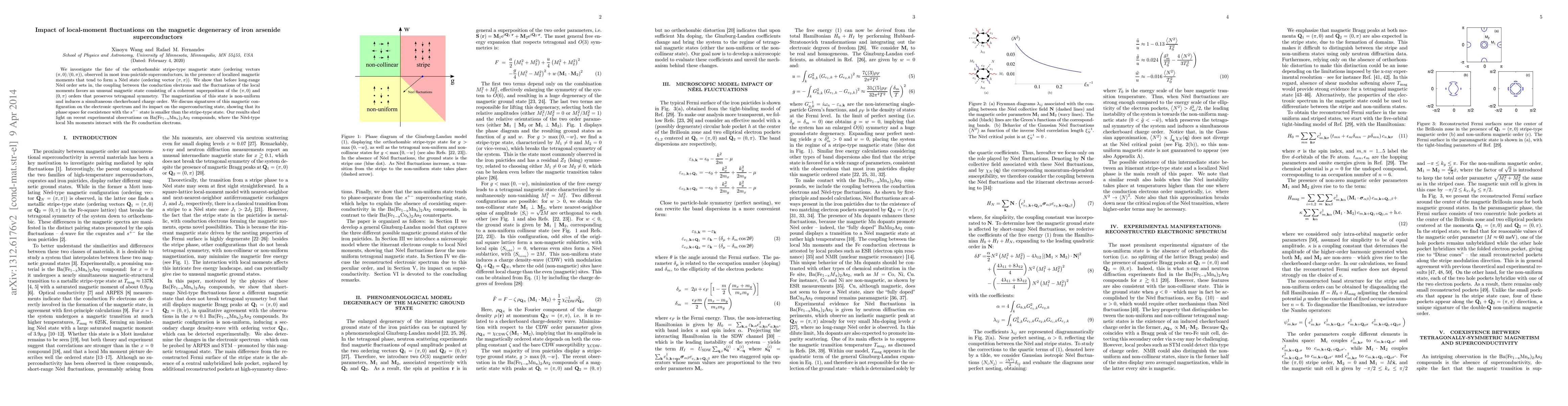 We investigate the fate of the orthorhombic stripe-type magnetic state (ordering vectors $\left(\pi,0\right)$/$\left(0,\pi\right)$), observed in most iron-pnictide superconductors, in the presence of localized magnetic moments that tend to form a Neel state (ordering vector $\left(\pi,\pi\right)$). We show that before long-range Neel order sets in, the coupling between the conduction electrons and the fluctuations of the local moments favors an unusual magnetic state consisting of a coherent superposition of the $\left(\pi,0\right)$ and $\left(0,\pi\right)$ orders that preserves tetragonal symmetry. The magnetization of this state is non-uniform and induces a simultaneous checkerboard charge order. We discuss signatures of this magnetic configuration on the electronic spectrum and its impact on the superconducting state, showing that its phase space for coexistence with the $s^{+-}$ state is smaller than the stripe-type state. Our results shed light on recent experimental observations on $\mathrm{Ba(Fe_{1-x}Mn_{x})_{2}As_{2}}$ compounds, where the Neel-type local Mn moments interact with the Fe conduction electrons.