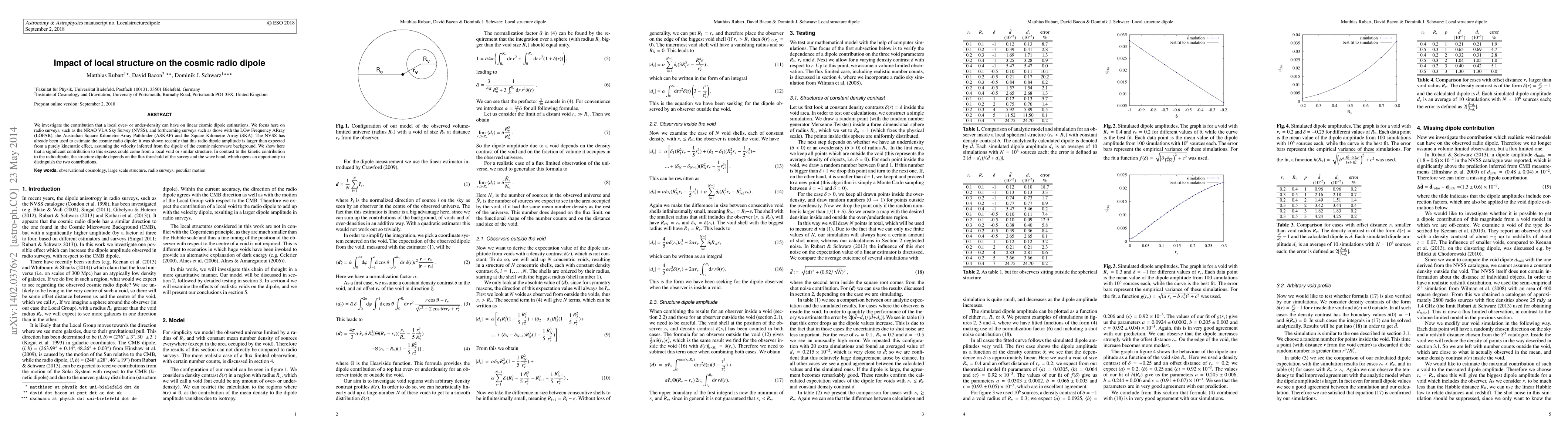 We investigate the contribution that a local over- or under-density can have on linear cosmic dipole estimations. We focus here on radio surveys, such as the NRAO VLA Sky Survey (NVSS), and forthcoming surveys such as those with the LOw Frequency ARray (LOFAR), the Australian Square Kilometre Array Pathfinder (ASKAP) and the Square Kilometre Array (SKA). The NVSS has already been used to estimate the cosmic radio dipole; it was shown recently that this radio dipole amplitude is larger than expected from a purely kinematic effect, assuming the velocity inferred from the dipole of the cosmic microwave background. We show here that a significant contribution to this excess could come from a local void or similar structure. In contrast to the kinetic contribution to the radio dipole, the structure dipole depends on the flux threshold of the survey and the wave band, which opens the chance to distinguish the two contributions.