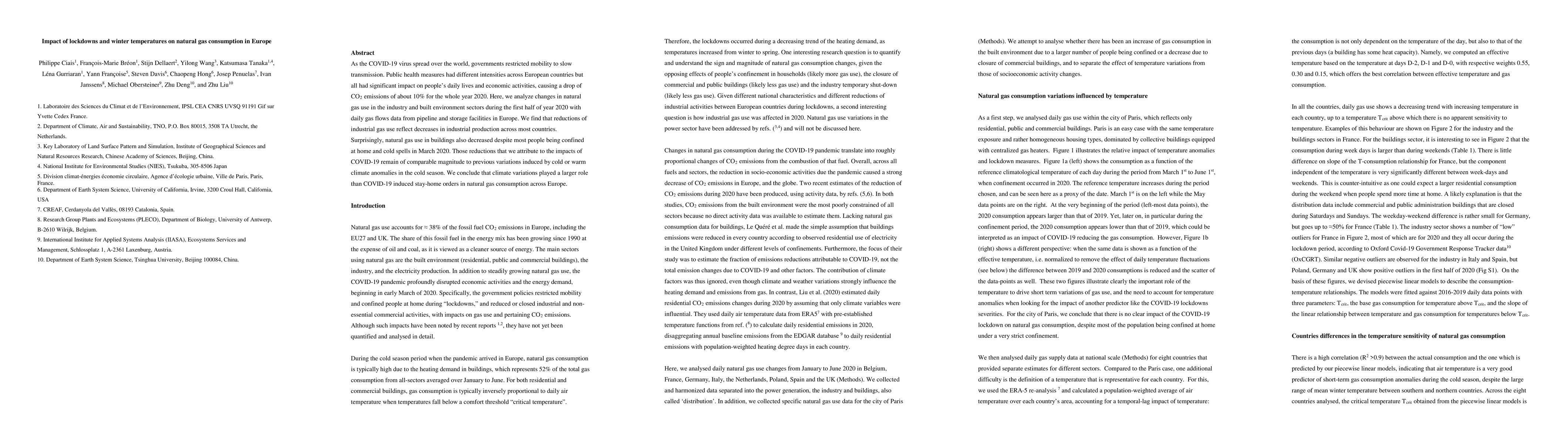 This study examines the impact of COVID-19 lockdowns and winter temperatures on natural gas consumption in Europe, finding that industrial gas use decreased in line with reduced production, while residential gas use surprisingly fell despite colder weather. The research concludes that climate variations had a more significant effect on gas consumption than the pandemic-induced restrictions.