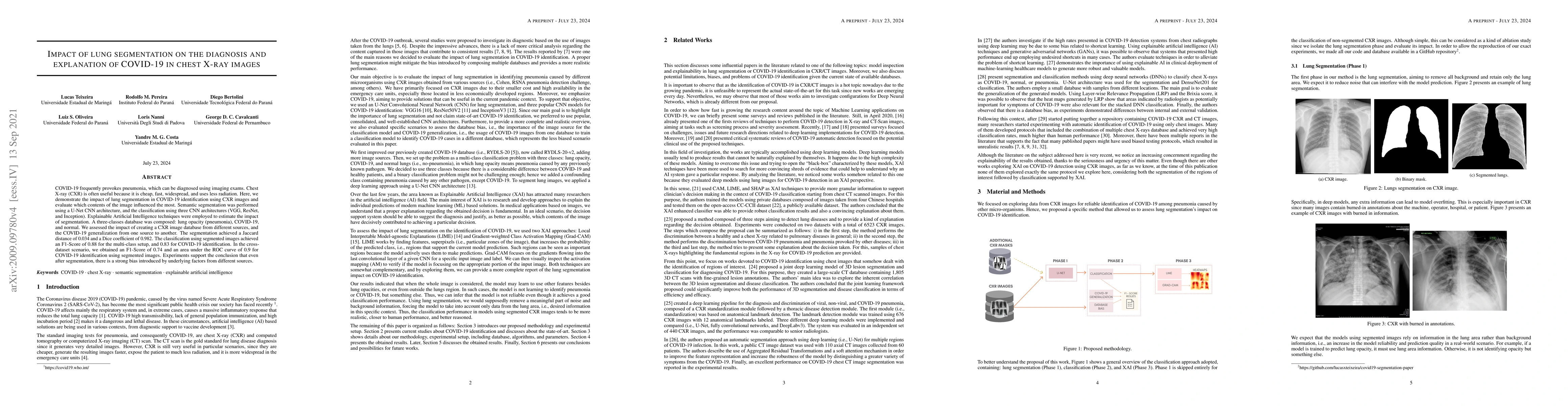 COVID-19 frequently provokes pneumonia, which can be diagnosed using imaging exams. Chest X-ray (CXR) is often useful because it is cheap, fast, widespread, and uses less radiation. Here, we demonstrate the impact of lung segmentation in COVID-19 identification using CXR images and evaluate which contents of the image influenced the most. Semantic segmentation was performed using a U-Net CNN architecture, and the classification using three CNN architectures (VGG, ResNet, and Inception). Explainable Artificial Intelligence techniques were employed to estimate the impact of segmentation. A three-classes database was composed: lung opacity (pneumonia), COVID-19, and normal. We assessed the impact of creating a CXR image database from different sources, and the COVID-19 generalization from one source to another. The segmentation achieved a Jaccard distance of 0.034 and a Dice coefficient of 0.982. The classification using segmented images achieved an F1-Score of 0.88 for the multi-class setup, and 0.83 for COVID-19 identification. In the cross-dataset scenario, we obtained an F1-Score of 0.74 and an area under the ROC curve of 0.9 for COVID-19 identification using segmented images. Experiments support the conclusion that even after segmentation, there is a strong bias introduced by underlying factors from different sources.