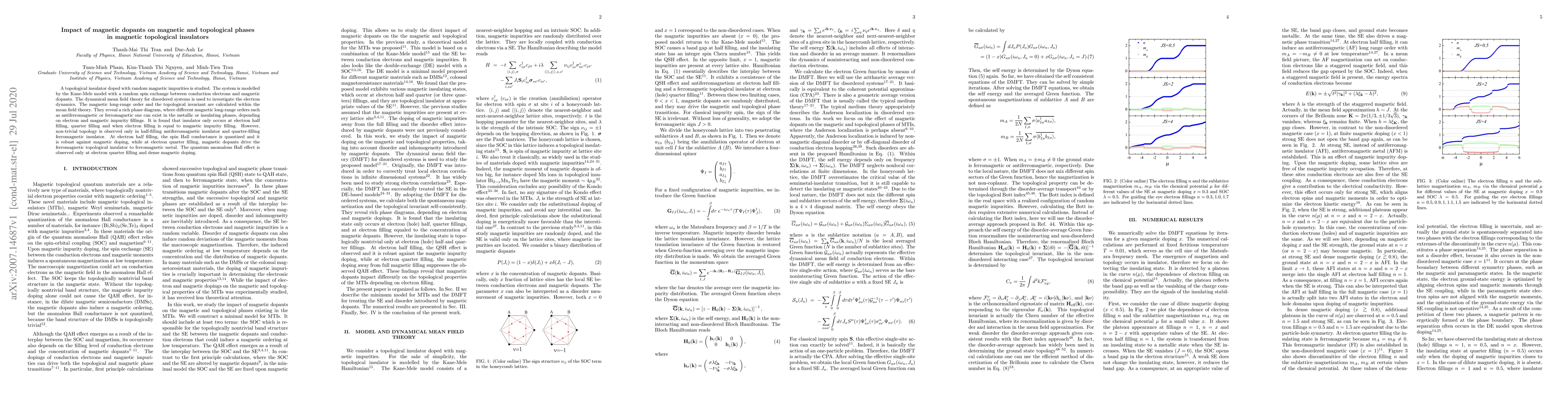 This paper explores the effects of magnetic doping on magnetic and topological phases in magnetic topological insulators using the Kane-Mele model and dynamical mean field theory. It reveals a complex phase diagram with distinct magnetic orders and topological properties, showing that non-trivial topology is robust at electron half-filling and the quantum anomalous Hall effect occurs at quarter-filling with dense magnetic doping.