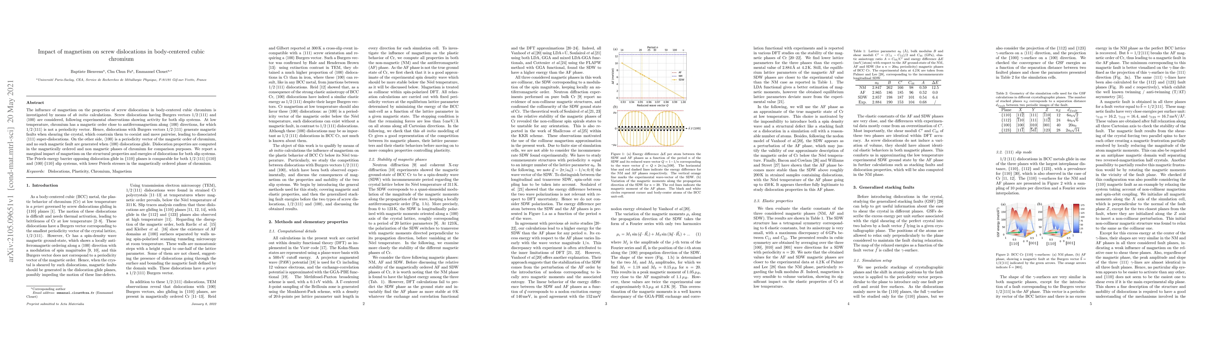 This study investigates the effect of magnetism on screw dislocations in body-centered cubic chromium using ab initio calculations. It finds that 1/2 <111> dislocations generate magnetic faults, leading to paired movement, while 1/2 <100> dislocations do not, with minimal impact on dislocation energies and structural properties.