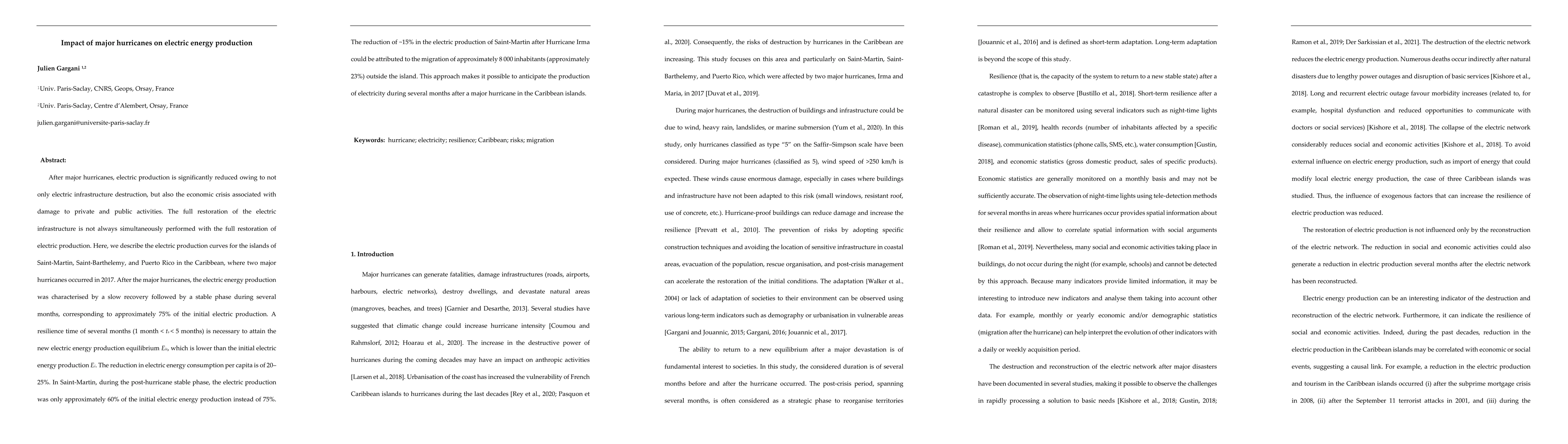 After major hurricanes, electric production is significantly reduced owing to not only electric infrastructure destruction, but also the economic crisis associated with damage to private and public activities. The full restoration of the electric infrastructure is not always simultaneously performed with the full restoration of electric production. Here, we describe the electric production curves for the islands of Saint-Martin, Saint-Barthelemy, and Puerto Rico in the Caribbean, where two major hurricanes occurred in 2017. After the major hurricanes, the electric energy production was characterised by a slow recovery followed by a stable phase during several months, corresponding to approximately $75\%$ of the initial electric production. A resilience time of several months (1 month $< t_s <$ 5 months) is necessary to attain the new electric energy production equilibrium $E_{is}$, which is lower than the initial electric energy production $E_i$. The reduction in electric energy consumption per capita is of $20-25\%$. In Saint-Martin, during the post-hurricane stable phase, the electric production was only approximately $60\%$ of the initial electric energy production instead of $75\%$. The reduction of 15 percent in the electric production of Saint-Martin after Hurricane Irma could be attributed to the migration of approximately 8 000 inhabitants (approximately $23\%$) outside the island. This approach makes it possible to anticipate the production of electricity during several months after a major hurricane in the Caribbean islands.