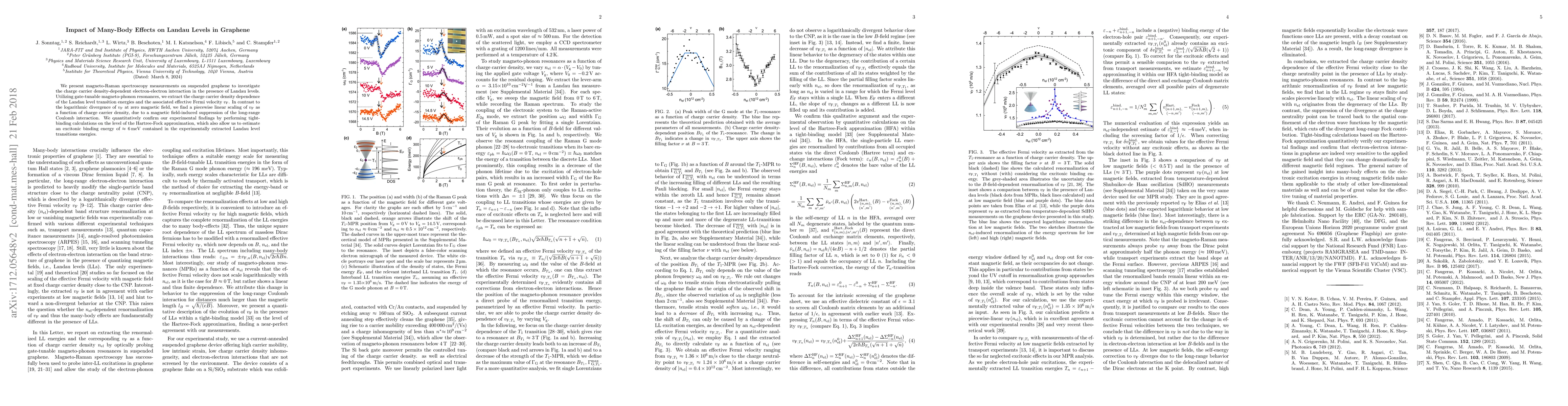 This study uses magneto-Raman spectroscopy to explore electron-electron interactions in graphene under Landau levels, finding a linear scaling of effective Fermi velocity with charge carrier density, attributed to magnetic field-induced suppression of long-range Coulomb interactions, and confirms these results via tight-binding calculations and estimates an excitonic binding energy of around 6 meV.