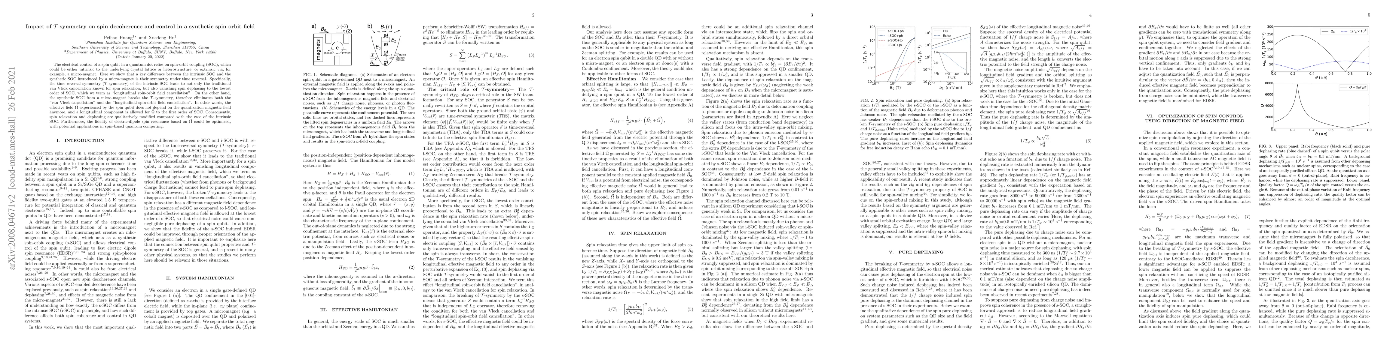 The electrical control of a spin qubit in a quantum dot relies on spin-orbit coupling (SOC), which could be either intrinsic to the underlying crystal lattice or heterostructure, or extrinsic via, for example, a micro-magnet. Here we show that a key difference between the intrinsic SOC and the synthetic SOC introduced by a micro-magnet is their symmetry under time reversal. Specifically, the time-reversal symmetry ($\mathcal{T}$-symmetry) of the intrinsic SOC leads to not only the traditional van Vleck cancellation known for spin relaxation, but also vanishing spin dephasing to the lowest order of SOC, which we term as "longitudinal spin-orbit field cancellation". On the other hand, the synthetic SOC from a micro-magnet breaks the $\mathcal{T}$-symmetry, therefore eliminates both the "van Vleck cancellation" and the "longitudinal spin-orbit field cancellation". In other words, the effective field $\vec\Omega$ experienced by the spin qubit does not depend on the quantization magnetic field anymore, and a longitudinal component is allowed for $\vec\Omega$ to the first order of SOC. Consequently, spin relaxation and dephasing are qualitatively modified compared with the case of the intrinsic SOC. Furthermore, the fidelity of electric-dipole spin resonance based on $\vec\Omega$ could be optimized, with potential applications in spin-based quantum computing.