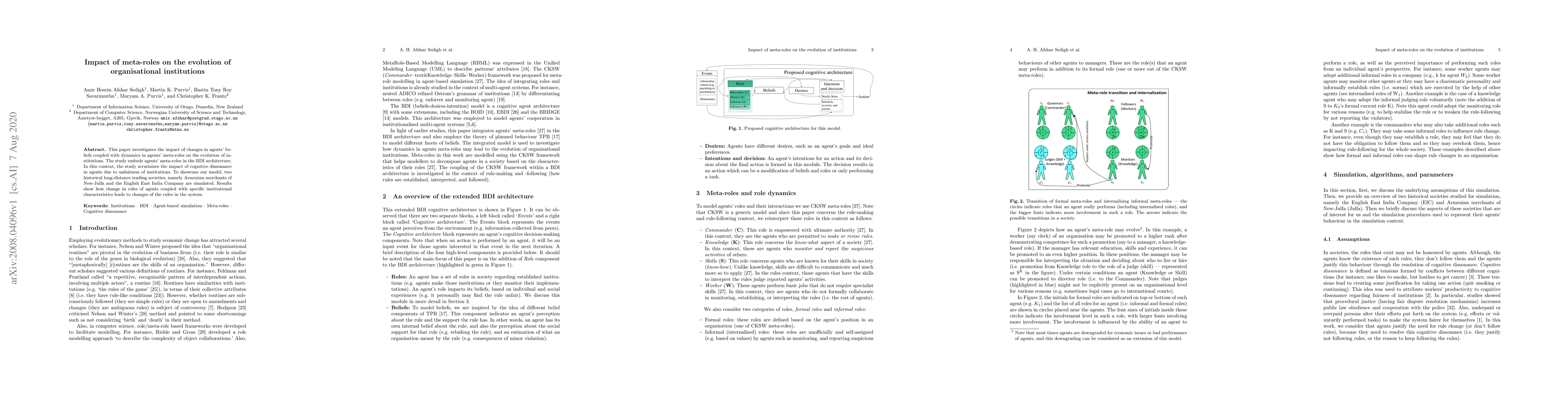 This paper investigates the impact of changes in agents' beliefs coupled with dynamics in agents' meta-roles on the evolution of institutions. The study embeds agents' meta-roles in the BDI architecture. In this context, the study scrutinises the impact of cognitive dissonance in agents due to unfairness of institutions. To showcase our model, two historical long-distance trading societies, namely Armenian merchants of New-Julfa and the English East India Company are simulated. Results show how change in roles of agents coupled with specific institutional characteristics leads to changes of the rules in the system.