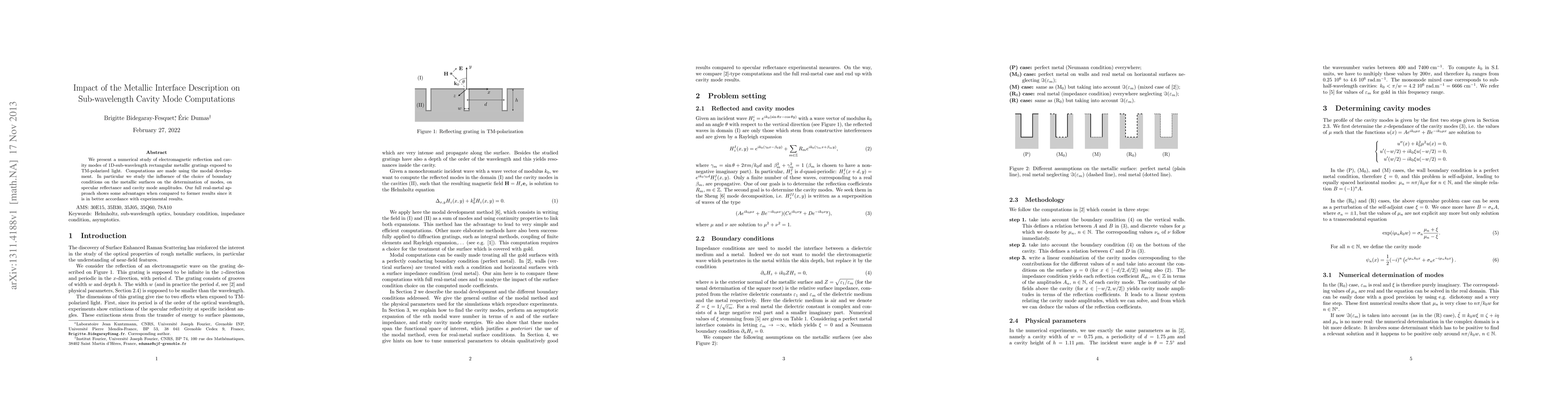 This paper investigates the effect of metallic interface boundary conditions on the electromagnetic reflection and cavity modes in 1D sub-wavelength rectangular metallic gratings under TM-polarized light, using modal development computations. The study finds that a full real-metal approach provides more accurate results compared to previous methods, aligning better with experimental data.