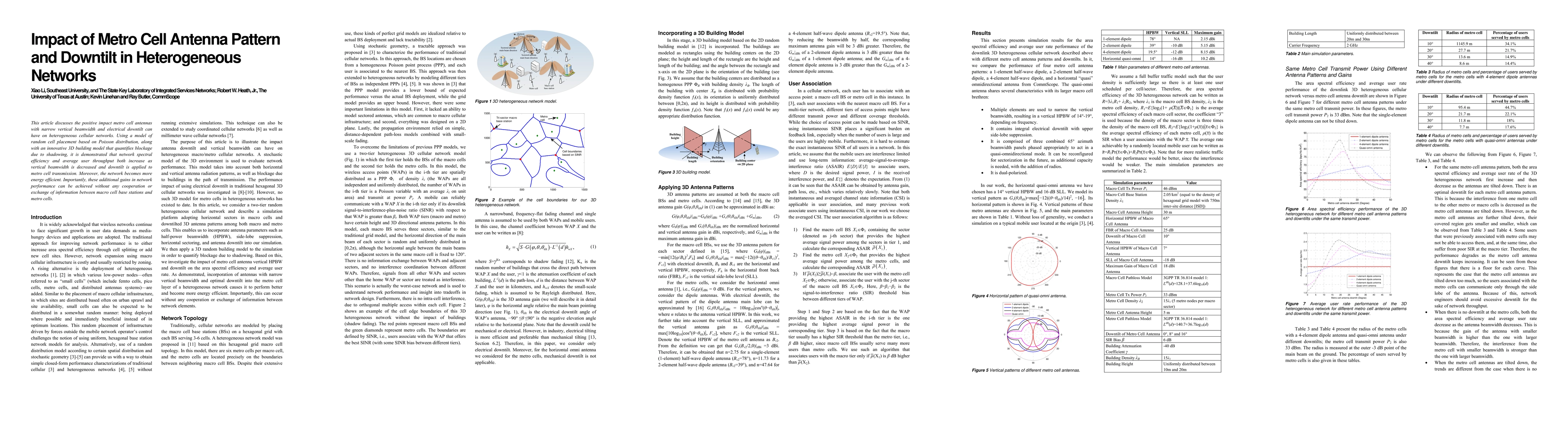 Metro cell antennas with narrow vertical beamwidth and electrical downtilt improve network spectral efficiency, average user throughput, and energy efficiency in heterogeneous networks without requiring cooperation between macro and metro cells.