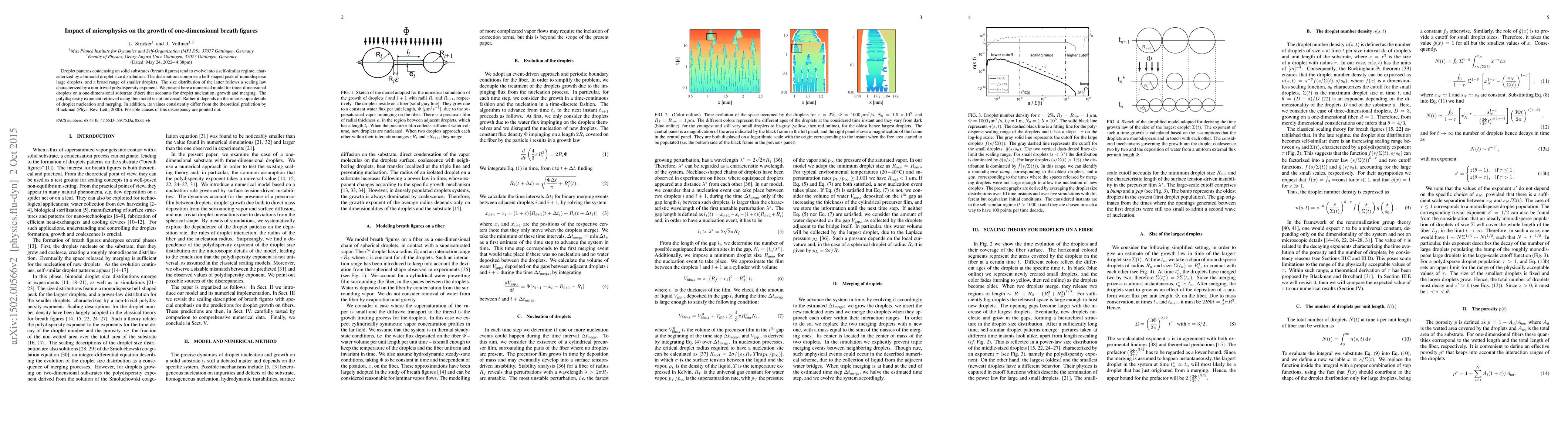 Droplet patterns condensing on solid substrates (breath figures) tend to evolve into a self-similar regime, characterized by a bimodal droplet size distribution. The distributions comprise a bell-shaped peak of monodisperse large droplets, and a broad range of smaller droplets. The size distribution of the latter follows a scaling law characterized by a non-trivial polydispersity exponent. We present here a numerical model for three-dimensional droplets on a one-dimensional substrate (fiber) that accounts for droplet nucleation, growth and merging. The polydispersity exponent retrieved using this model is not universal. Rather it depends on the thickness of the fiber and on details of the droplet interaction leading to merging. In addition, its values consistently differ from the theoretical prediction by Blackman (Phys. Rev. Lett., 2000). Possible causes of this discrepancy are pointed out.