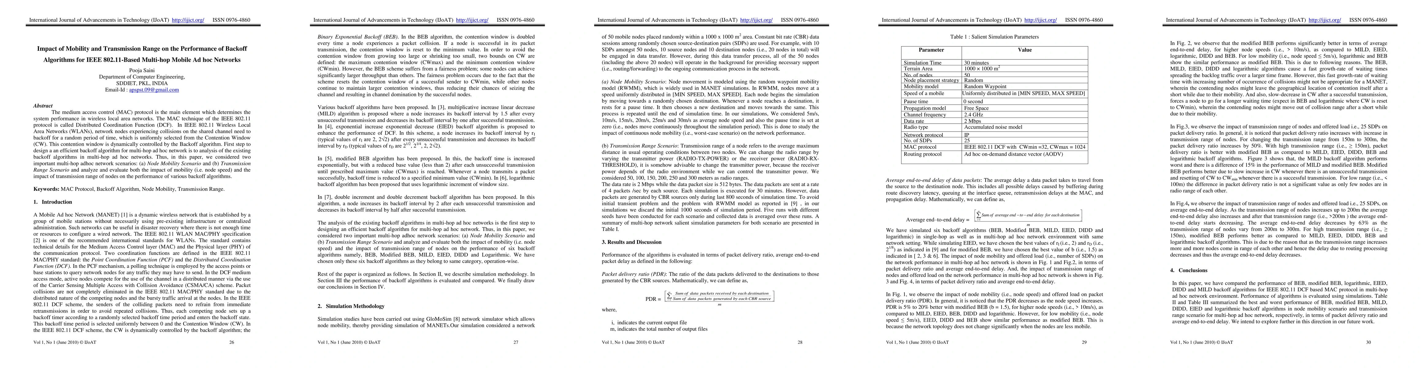 This paper analyzes the impact of node mobility and transmission range on the performance of backoff algorithms in IEEE 802.11-based multi-hop mobile ad hoc networks. It evaluates how varying node speeds and transmission ranges affect collision management and overall network efficiency.