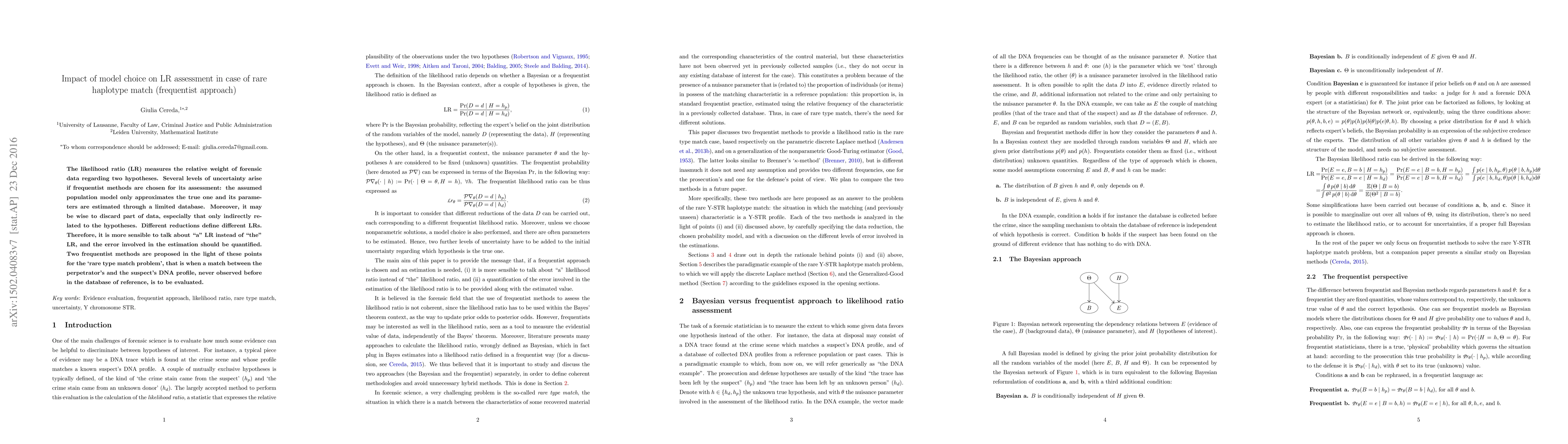 The likelihood ratio (LR) measures the relative weight of forensic data regarding two hypotheses. Several levels of uncertainty arise if frequentist methods are chosen for its assessment: the assumed population model only approximates the true one and its parameters are estimated through a database. Moreover, it may be wise to discard part of data, especially that only indirectly related to the hypotheses. Different reductions define different LRs. Therefore, it is more sensible to talk about "a" LR instead of "the" LR, and the error involved in the estimation should be quantified. Two frequentist methods are proposed in the light of these points for the `rare type match problem', that is when a match between the perpetrator's and the suspect's DNA profile, never observed before in the database of reference, is to be evaluated.