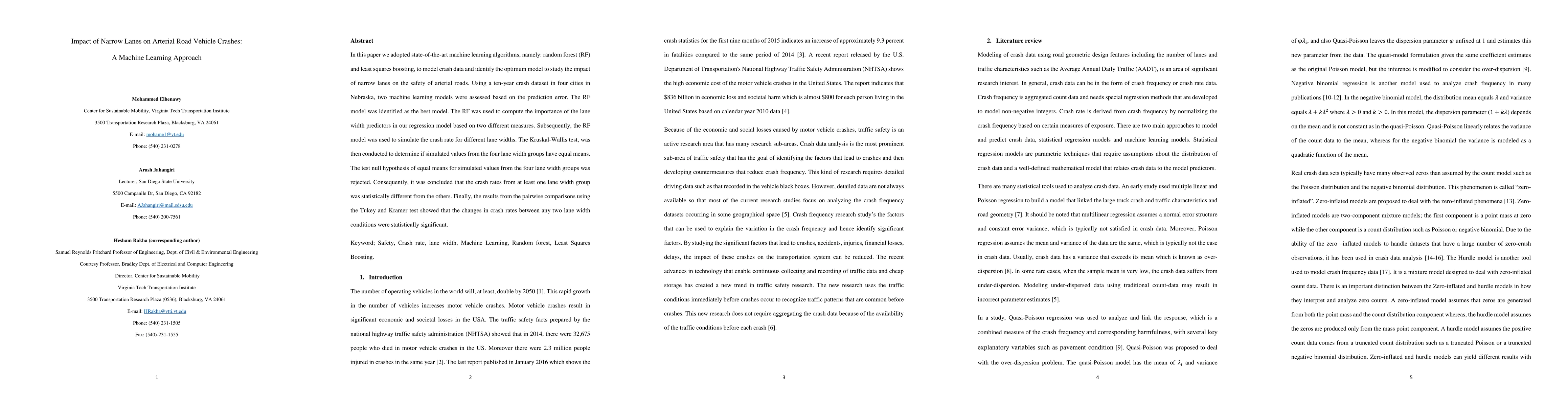 In this paper we adopted state-of-the-art machine learning algorithms, namely: random forest (RF) and least squares boosting, to model crash data and identify the optimum model to study the impact of narrow lanes on the safety of arterial roads. Using a ten-year crash dataset in four cities in Nebraska, two machine learning models were assessed based on the prediction error. The RF model was identified as the best model. The RF was used to compute the importance of the lane width predictors in our regression model based on two different measures. Subsequently, the RF model was used to simulate the crash rate for different lane widths. The Kruskal-Wallis test, was then conducted to determine if simulated values from the four lane width groups have equal means. The test null hypothesis of equal means for simulated values from the four lane width groups was rejected. Consequently, it was concluded that the crash rates from at least one lane width group was statistically different from the others. Finally, the results from the pairwise comparisons using the Tukey and Kramer test showed that the changes in crash rates between any two lane width conditions were statistically significant.