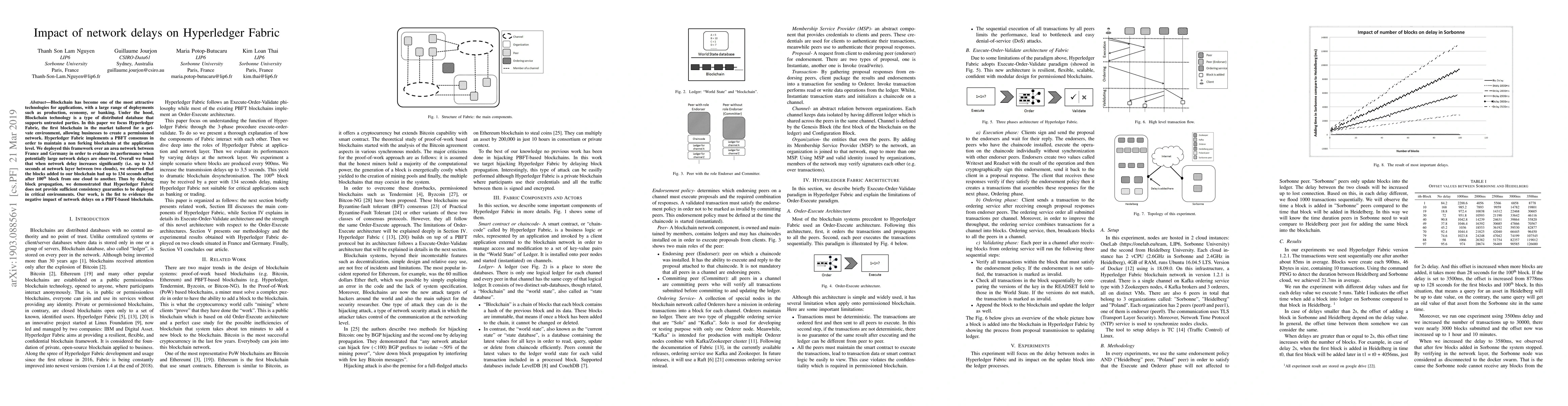 Blockchain has become one of the most attractive technologies for applications, with a large range of deployments such as production, economy, or banking. Under the hood, Blockchain technology is a type of distributed database that supports untrusted parties. In this paper we focus Hyperledger Fabric, the first blockchain in the market tailored for a private environment, allowing businesses to create a permissioned network. Hyperledger Fabric implements a PBFT consensus in order to maintain a non forking blockchain at the application level. We deployed this framework over an area network between France and Germany in order to evaluate its performance when potentially large network delays are observed. Overall we found that when network delay increases significantly (i.e. up to 3.5 seconds at network layer between two clouds), we observed that the blocks added to our blockchain had up to 134 seconds offset after 100 th block from one cloud to another. Thus by delaying block propagation, we demonstrated that Hyperledger Fabric does not provide sufficient consistency guaranties to be deployed in critical environments. Our work, is the fist to evidence the negative impact of network delays on a PBFT-based blockchain.