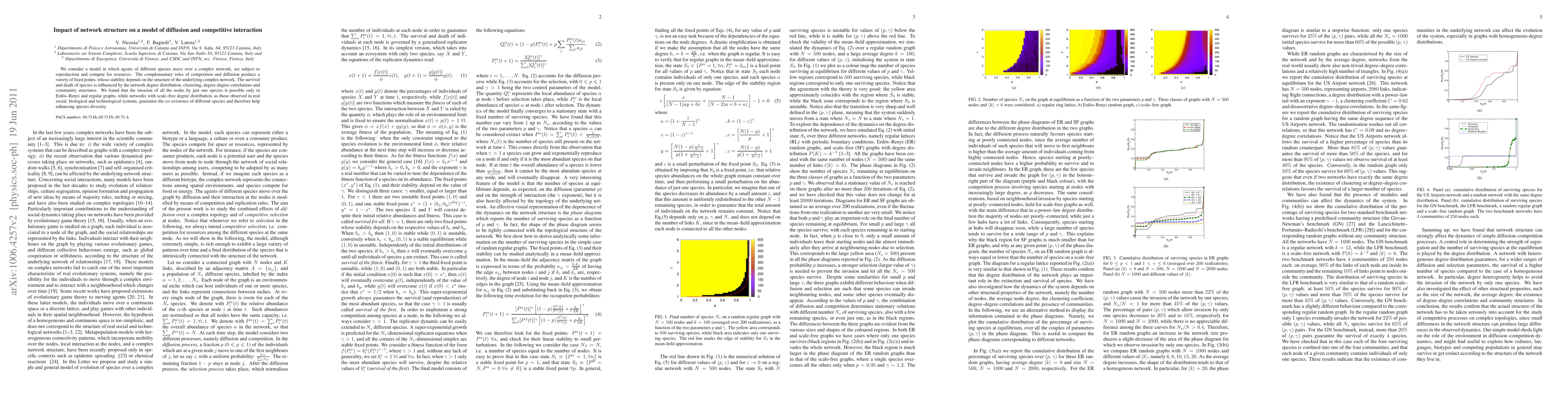 We consider a model in which agents of different species move over a complex network, are subject to reproduction and compete for resources. The complementary roles of competition and diffusion produce a variety of fixed points, whose stability depends on the structure of the underlying complex network. The survival and death of species is influenced by the network degree distribution, clustering, degree-degree correlations and community structures. We found that the invasion of all the nodes by just one species is possible only in Erdos-Renyi and regular graphs, while networks with scale--free degree distribution, as those observed in real social, biological and technological systems, guarantee the co-existence of different species and therefore help enhancing species diversity.