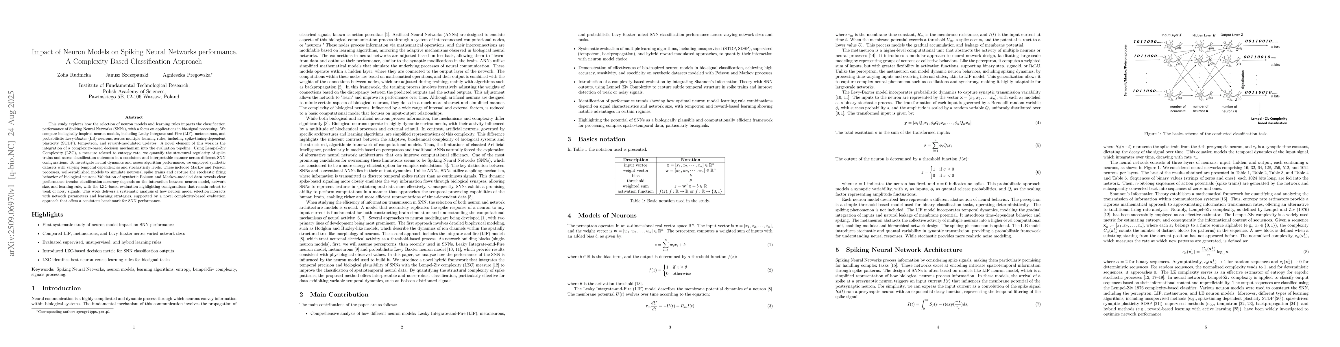 This study explores how the selection of neuron models and learning rules impacts the classification performance of Spiking Neural Networks (SNNs), with a focus on applications in bio-signal processing. We compare biologically inspired neuron models, including Leaky Integrate-and-Fire (LIF), metaneurons, and probabilistic Levy-Baxter (LB) neurons, across multiple learning rules, including spike-timing-dependent plasticity (STDP), tempotron, and reward-modulated updates. A novel element of this work is the integration of a complexity-based decision mechanism into the evaluation pipeline. Using Lempel-Ziv Complexity (LZC), a measure related to entropy rate, we quantify the structural regularity of spike trains and assess classification outcomes in a consistent and interpretable manner across different SNN configurations. To investigate neural dynamics and assess algorithm performance, we employed synthetic datasets with varying temporal dependencies and stochasticity levels. These included Markov and Poisson processes, well-established models to simulate neuronal spike trains and capture the stochastic firing behavior of biological neurons.Validation of synthetic Poisson and Markov-modeled data reveals clear performance trends: classification accuracy depends on the interaction between neuron model, network size, and learning rule, with the LZC-based evaluation highlighting configurations that remain robust to weak or noisy signals. This work delivers a systematic analysis of how neuron model selection interacts with network parameters and learning strategies, supported by a novel complexity-based evaluation approach that offers a consistent benchmark for SNN performance.