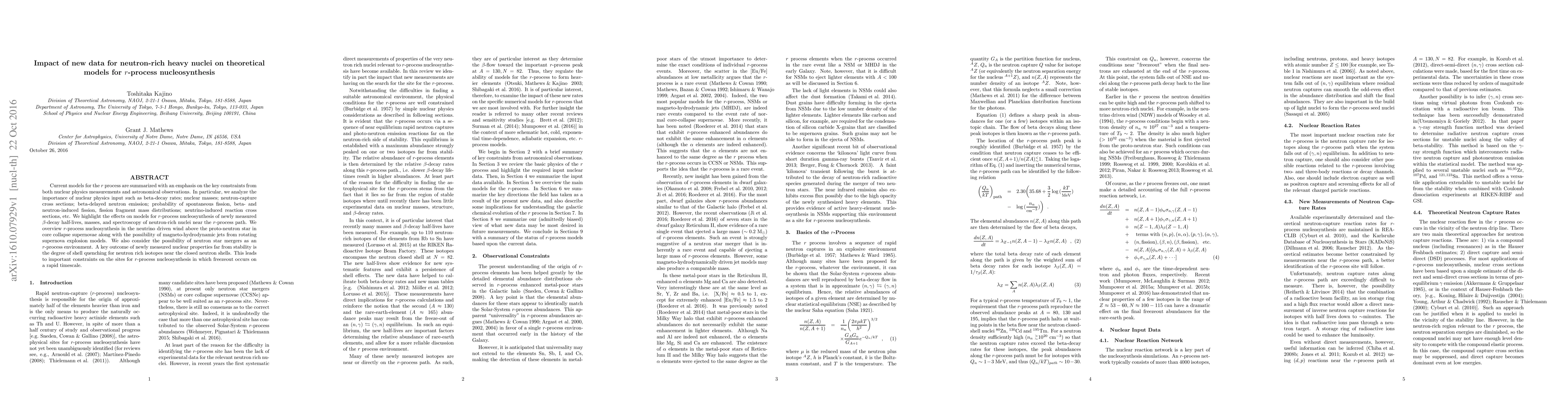 Current models for the $r$ process are summarized with an emphasis on the key constraints from both nuclear physics measurements and astronomical observations. In particular, we analyze the importance of nuclear physics input such as beta-decay rates; nuclear masses; neutron-capture cross sections; beta-delayed neutron emission; probability of spontaneous fission, beta- and neutron-induced fission, fission fragment mass distributions; neutrino-induced reaction cross sections, etc. We highlight the effects on models for $r$-process nucleosynthesis of newly measured $\beta$-decay half-lives, masses, and spectroscopy of neutron-rich nuclei near the $r$-process path. We overview r-process nucleosynthesis in the neutrino driven wind above the proto-neutron star in core collapse supernovae along with the possibility of magneto-hydrodynamic jets from rotating supernova explosion models. We also consider the possibility of neutron star mergers as an r-process environment. A key outcome of newly measured nuclear properties far from stability is the degree of shell quenching for neutron rich isotopes near the closed neutron shells. This leads to important constraints on the sites for $r$-process nucleosynthesis in which freezeout occurs on a rapid timescale.
