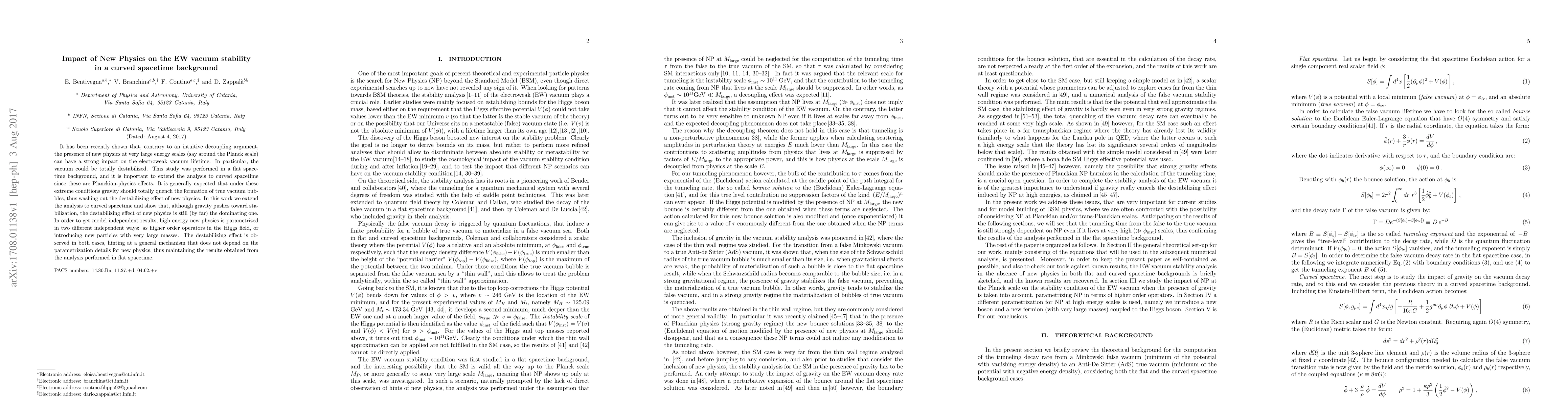 It has been recently shown that, contrary to an intuitive decoupling argument, the presence of new physics at very large energy scales (say around the Planck scale) can have a strong impact on the electroweak vacuum lifetime. In particular, the vacuum could be totally destabilized. This study was performed in a flat spacetime background, and it is important to extend the analysis to curved spacetime since these are Planckian-physics effects. It is generally expected that under these extreme conditions gravity should totally quench the formation of true vacuum bubbles, thus washing out the destabilizing effect of new physics. In this work we extend the analysis to curved spacetime and show that, although gravity pushes toward stabilization, the destabilizing effect of new physics is still (by far) the dominating one. In order to get model independent results, high energy new physics is parametrized in two different independent ways: as higher order operators in the Higgs field, or introducing new particles with very large masses. The destabilizing effect is observed in both cases, hinting at a general mechanism that does not depend on the parametrization details for new physics, thus maintaining the results obtained from the analysis performed in flat spacetime.