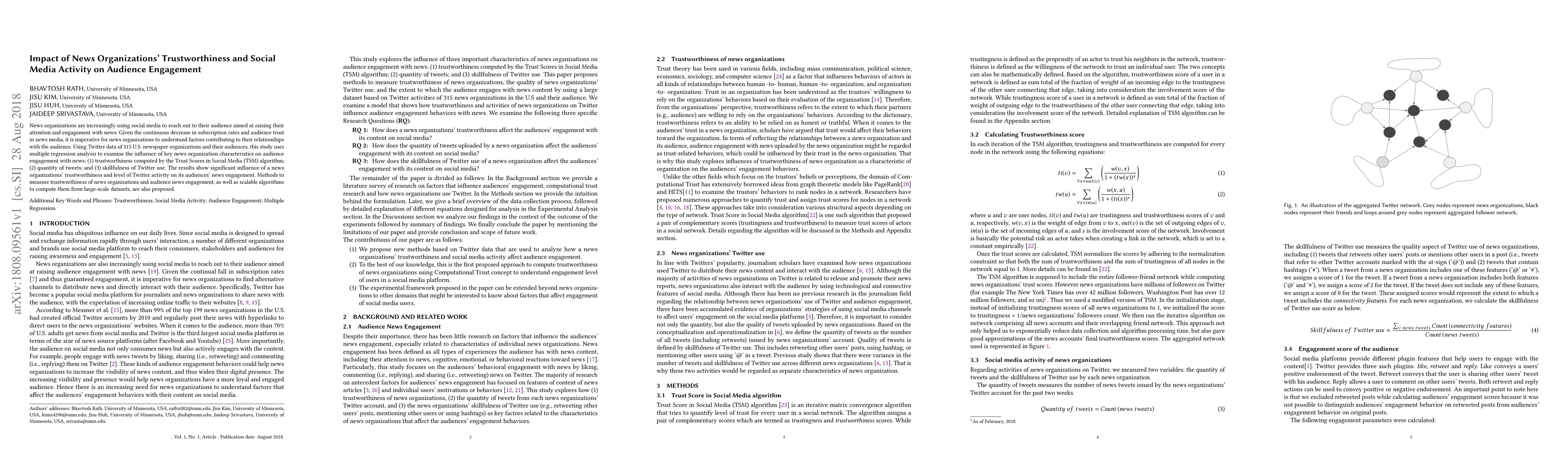 This study investigates the impact of news organizations' trustworthiness and social media activity on audience engagement using Twitter data from 315 U.S. newspapers. It finds significant influence of trustworthiness and Twitter activity levels on audience news engagement, proposing methods to measure these factors and scalable algorithms for large-scale datasets.