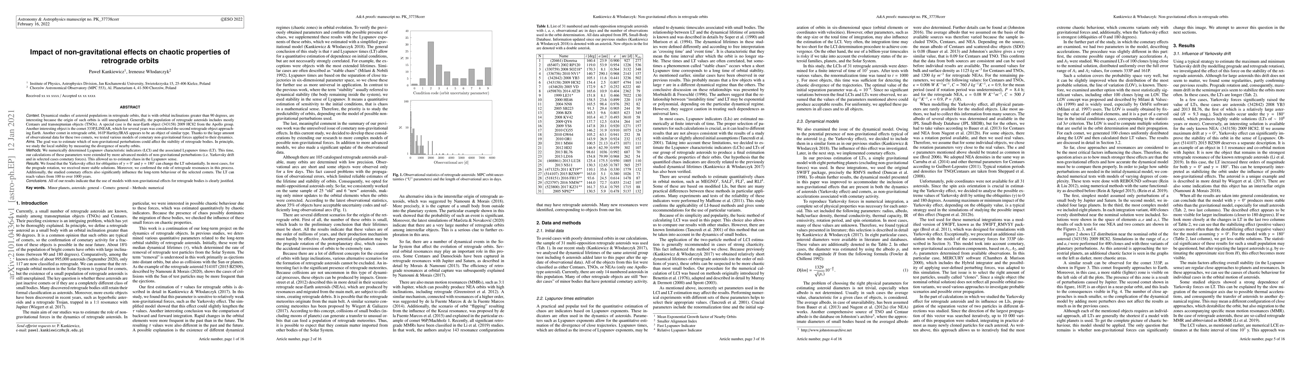 Dynamical studies of asteroid populations in retrograde orbits, that is with orbital inclinations greater than 90 degrees, are interesting because the origin of such orbits is still unexplained. Generally, the population of retrograde asteroids includes mostly Centaurs and transneptunian objects (TNOs). A special case is the near-Earth object (343158) 2009 HC82 from the Apollo group. Another interesting object is the comet 333P/LINEAR, which for several years was considered the second retrograde object approaching Earth. Another comet in retrograde orbit, 161P Hartley/IRAS appears to be an object of similar type. Thanks to the large amount of observational data for these two comets, we tested various models of cometary non-gravitational forces applied to their dynamics. The goal was to estimate which of non-gravitational perturbations could affect the stability of retrograde bodies. In principle, we study the local stability by measuring the divergence of nearby orbits. We numerically determined Lyapunov characteristic indicators (LCI) and the associated Lyapunov times (LT). This time, our calculations were extended by more advanced models of non-gravitational perturbations (i.e. Yarkovsky drift and in selected cases cometary forces). This allowed us to estimate chaos in the Lyapunov sense. We found that the Yarkovsky effect for obliquities of $\gamma=0^{\circ}$ and $\gamma=180^{\circ}$ can change the LT substantially. In most cases, for the prograde rotation, we received more stable solutions. Moreover, we confirmed the role of retrograde resonances in this process. Additionally, the studied cometary effects also significantly influence the long-term behaviour of the selected comets. The LT can reach values from 100 to over 1000 years. Conclusions. All of our results indicate that the use of models with non-gravitational effects for retrograde bodies is clearly justified.