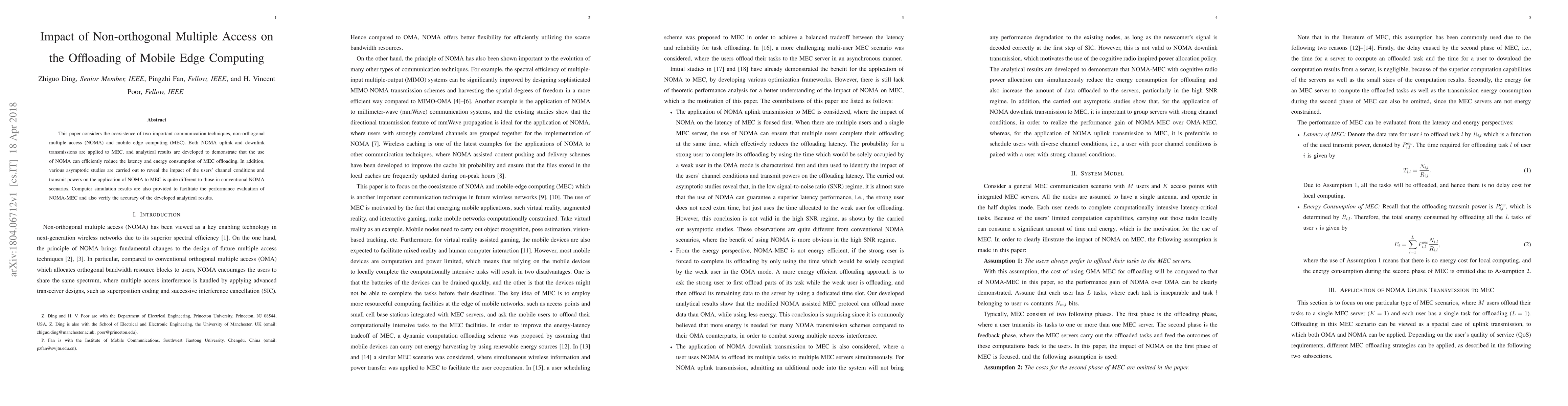 This paper investigates the integration of non-orthogonal multiple access (NOMA) with mobile edge computing (MEC) to reduce latency and energy consumption in offloading tasks. Analytical and simulation results show that NOMA's impact on MEC differs from conventional NOMA scenarios, depending on users' channel conditions and transmit powers.