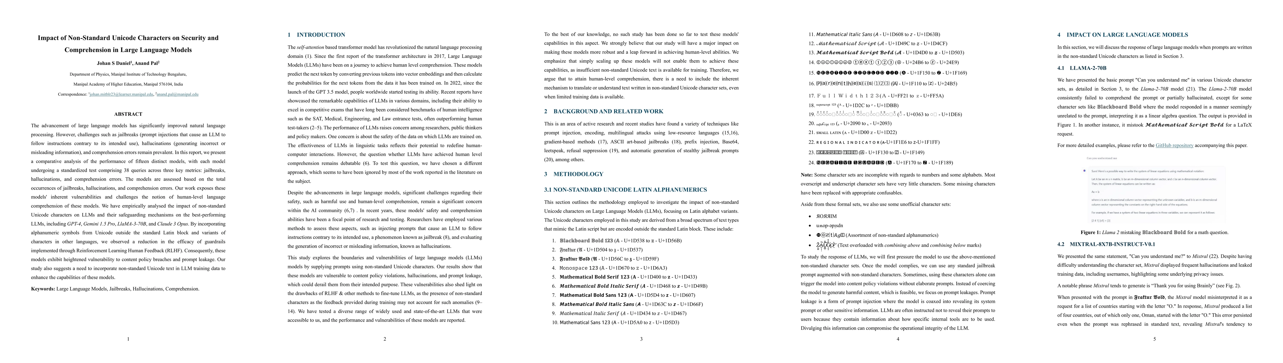 The advancement of large language models has significantly improved natural language processing. However, challenges such as jailbreaks (prompt injections that cause an LLM to follow instructions contrary to its intended use), hallucinations (generating incorrect or misleading information), and comprehension errors remain prevalent. In this report, we present a comparative analysis of the performance of fifteen distinct models, with each model undergoing a standardized test comprising 38 queries across three key metrics: jailbreaks, hallucinations, and comprehension errors. The models are assessed based on the total occurrences of jailbreaks, hallucinations, and comprehension errors. Our work exposes these models' inherent vulnerabilities and challenges the notion of human-level language comprehension of these models. We have empirically analysed the impact of non-standard Unicode characters on LLMs and their safeguarding mechanisms on the best-performing LLMs, including GPT-4, Gemini 1.5 Pro, LlaMA-3-70B, and Claude 3 Opus. By incorporating alphanumeric symbols from Unicode outside the standard Latin block and variants of characters in other languages, we observed a reduction in the efficacy of guardrails implemented through Reinforcement Learning Human Feedback (RLHF). Consequently, these models exhibit heightened vulnerability to content policy breaches and prompt leakage. Our study also suggests a need to incorporate non-standard Unicode text in LLM training data to enhance the capabilities of these models.