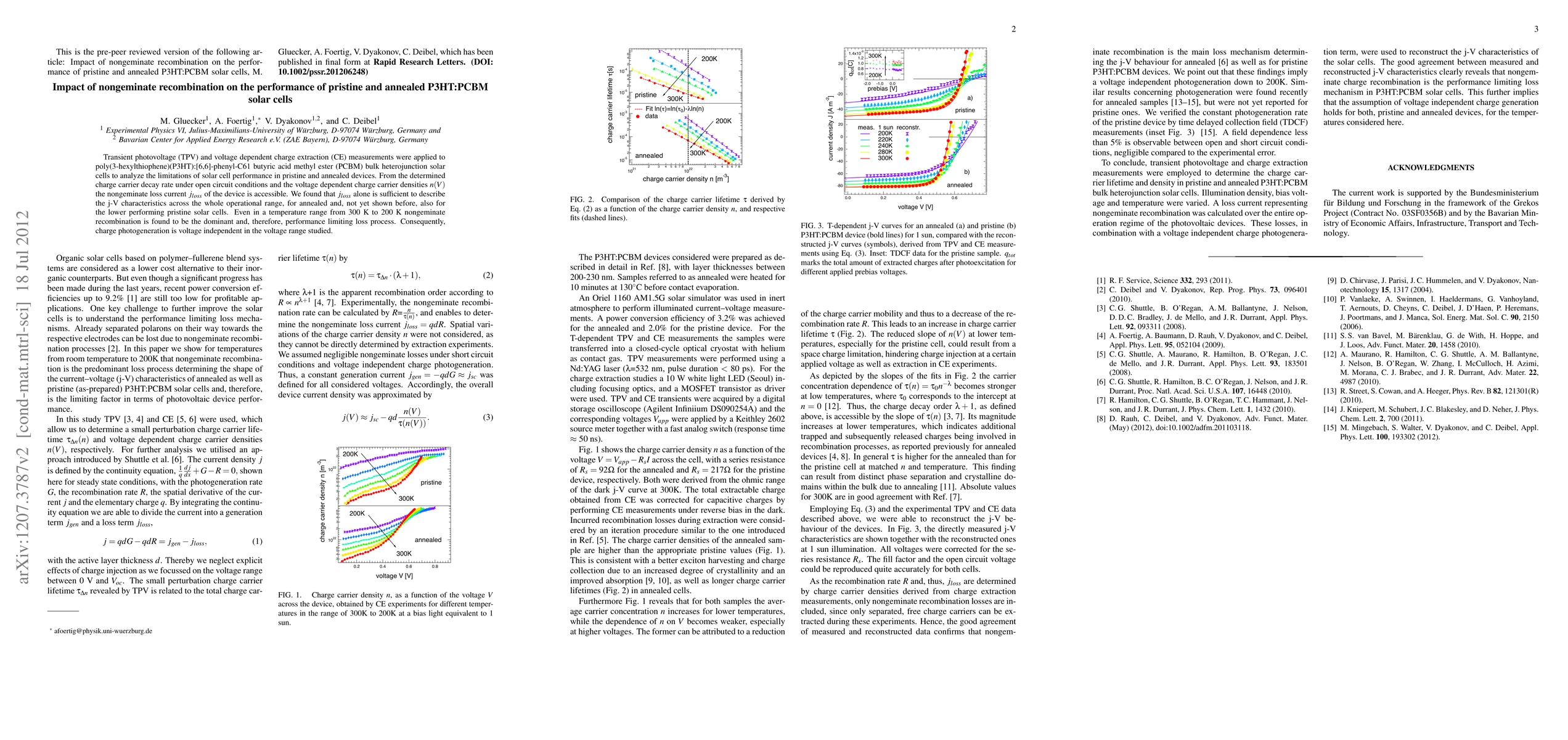 This study uses TPV and CE measurements to determine the impact of nongeminate recombination on P3HT:PCBM solar cells, finding that it is the dominant performance-limiting factor in both pristine and annealed devices across a temperature range of 300 K to 200 K. Nongeminate recombination alone explains the current-voltage characteristics in both cell types.