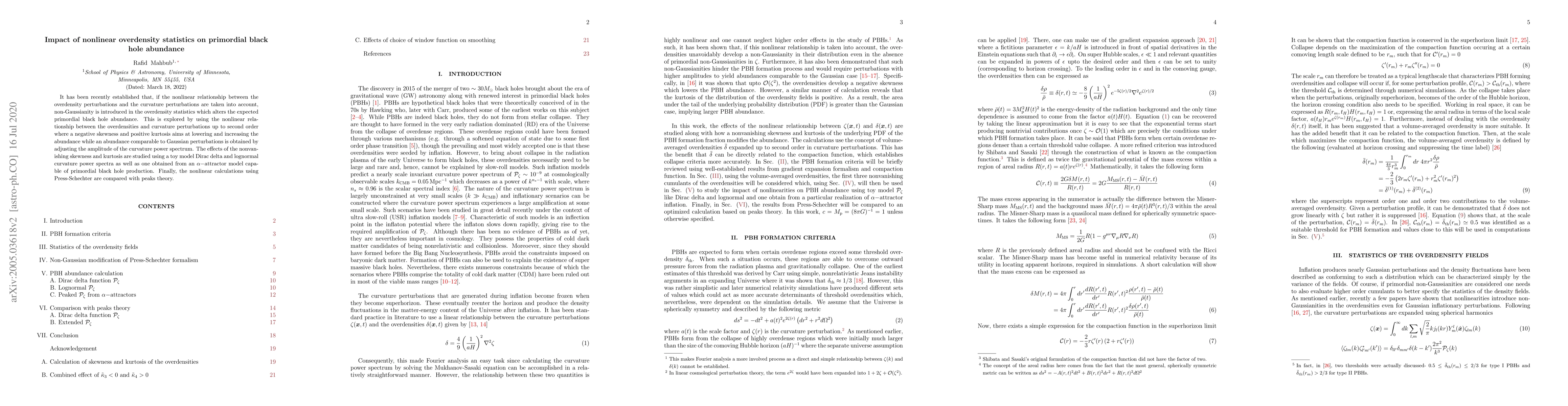 It has been recently established that, if the nonlinear relationship between the overdensity perturbations and the curvature perturbations are taken into account, non-Gaussianity is introduced in the overdensity statistics which alters the expected primordial black hole abundance. This is explored by using the nonlinear relationship between the overdensities and curvature perturbations up to second order where a negative skewness and positive kurtosis aims at lowering and increasing the abundance while an abundance comparable to Gaussian perturbations is obtained by adjusting the amplitude of the curvature power spectrum. The effects of the nonvanishing skewness and kurtosis are studied using a toy model Dirac delta and lognormal curvature power spectra as well as one obtained from an $\alpha-$attractor model capable of primordial black hole production. Finally, the nonlinear calculations using Press-Schechter are compared with peaks theory.