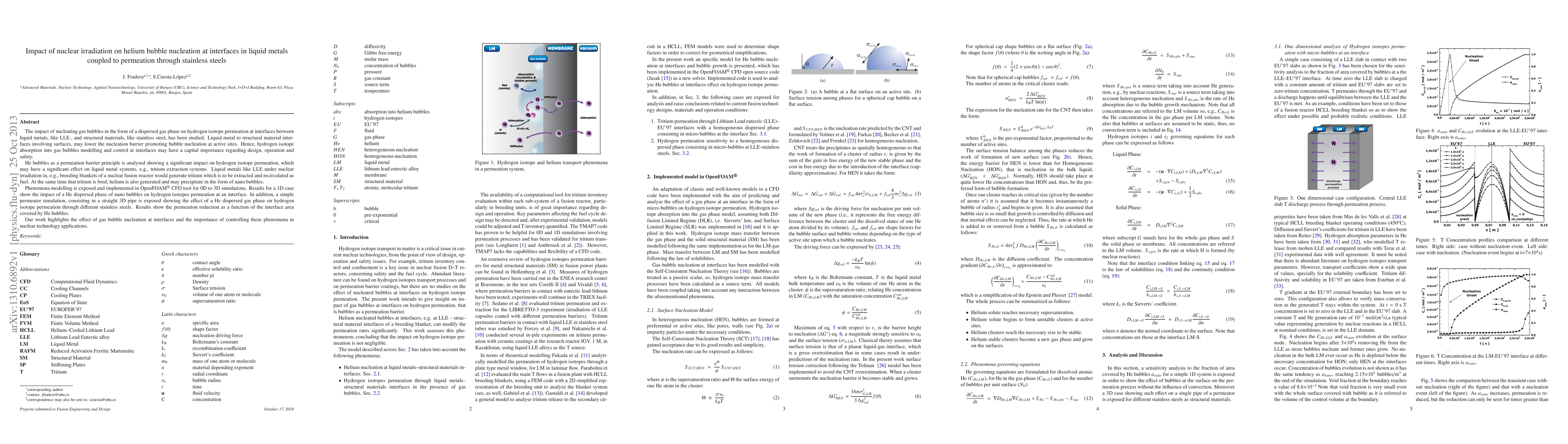 The impact of nucleating gas bubbles in the form of a dispersed gas phase on hydrogen isotope permeation at interfaces between liquid metals, like LLE, and structural materials, like stainless steel, has been studied. Liquid metal to structural material interfaces involving surfaces, may lower the nucleation barrier promoting bubble nucleation at active sites. Hence, hydrogen isotope absorption into gas bubbles modelling and control at interfaces may have a capital importance regarding design, operation and safety. He bubbles as a permeation barrier principle is analysed showing a significant impact on hydrogen isotope permeation, which may have a significant effect on liquid metal systems, e.g., tritium extraction systems. Liquid metals like LLE under nuclear irradiation in, e.g., breeding blankets of a nuclear fusion reactor would generate tritium which is to be extracted and recirculated as fuel. At the same time that tritium is bred, helium is also generated and may precipitate in the form of nano bubbles. Phenomena modelling is exposed and implemented in OpenFoam(r) CFD tool for 0D to 3D simulations. Results for a 1D case show the impact of a He dispersed phase of nano bubbles on hydrogen isotopes permeation at an interface. In addition, a simple permeator simulation, consisting in a straight 3D pipe is exposed showing the effect of a He dispersed gas phase on hydrogen isotope permeation through different stainless steels. Results show the permeation reduction as a function of the interface area covered by He bubbles. Our work highlights the effect of gas bubble nucleation at interfaces and the importance of controlling these phenomena in nuclear technology applications.