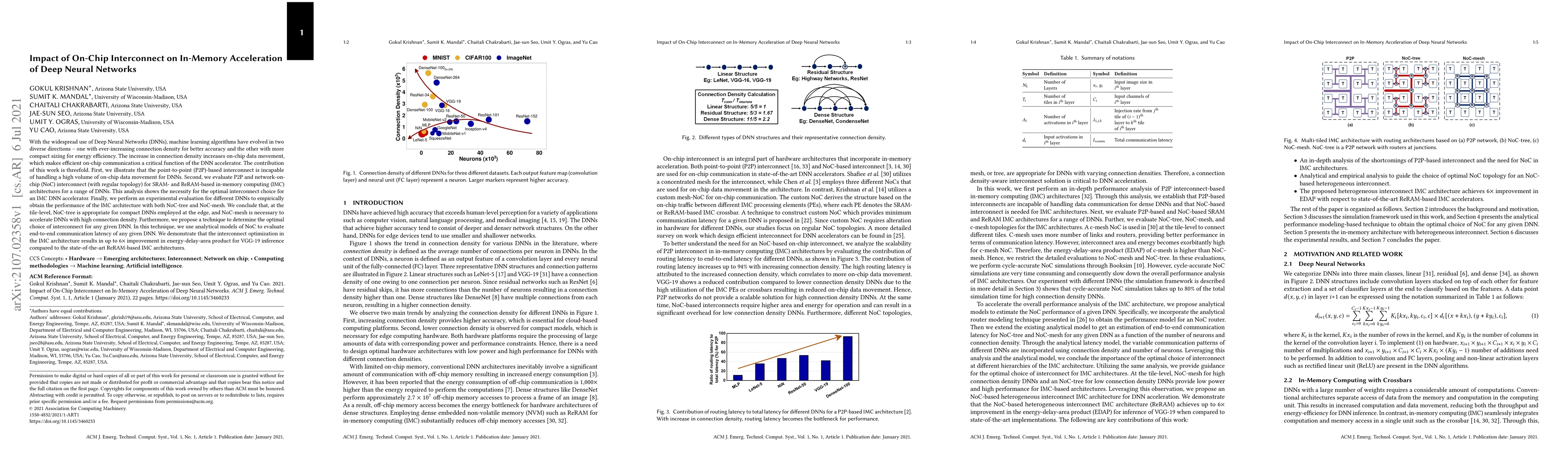 This paper investigates the impact of on-chip interconnects on the in-memory acceleration of Deep Neural Networks (DNNs), demonstrating that point-to-point interconnects are inadequate for high data movement. It evaluates network-on-chip (NoC) topologies for SRAM and ReRAM-based in-memory computing, concluding that NoC-tree is optimal for compact edge DNNs, while NoC-mesh is better for high-density DNNs, achieving up to 6× improvement in energy-delay-area product.