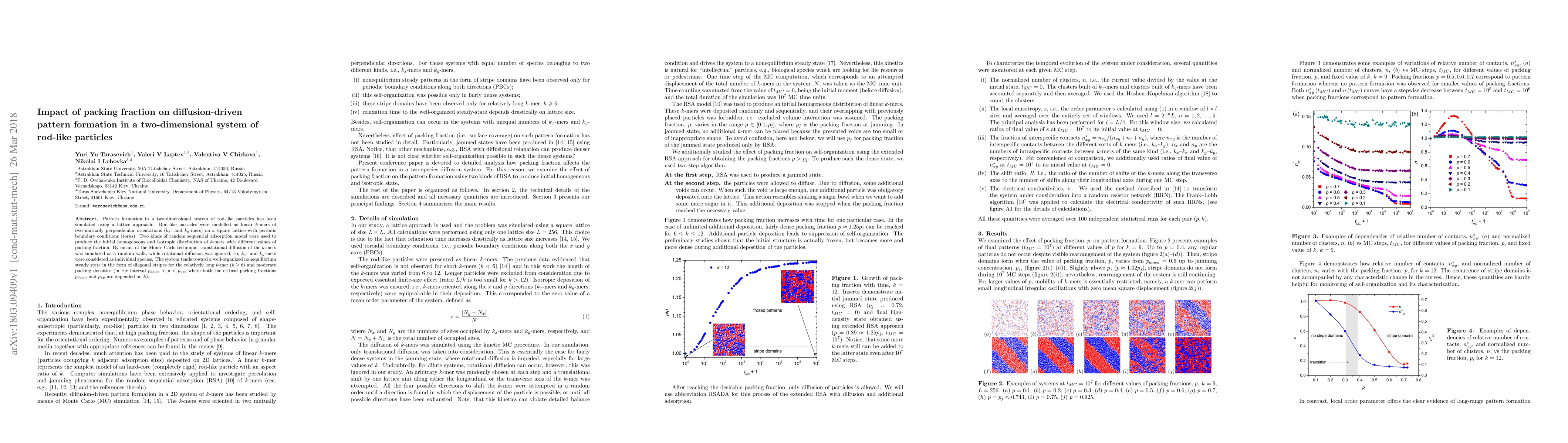 Pattern formation in a two-dimensional system of rod-like particles has been simulated using a lattice approach. Rod-like particles were modelled as linear $k$-mers of two mutually perpendicular orientations ($k_x$- and $k_y$-mers) on a square lattice with periodic boundary conditions (torus). Two kinds of random sequential adsorption model were used to produce the initial homogeneous and isotropic distribution of $k$-mers with different values of packing fraction. By means of the Monte Carlo technique, translational diffusion of the $k$-mers was simulated as a random walk, while rotational diffusion was ignored, so, $k_x$- and $k_y$-mers were considered as individual species. The system tends toward a well-organized nonequilibrium steady state in the form of diagonal stripes for the relatively long $k$-mer ($k \geq 6$) and moderate packing densities (in the interval $p_{down} < p < p_{up}$, where both the critical packing fractions $p_{down}$ and $p_{up}$ are depended on $k$).